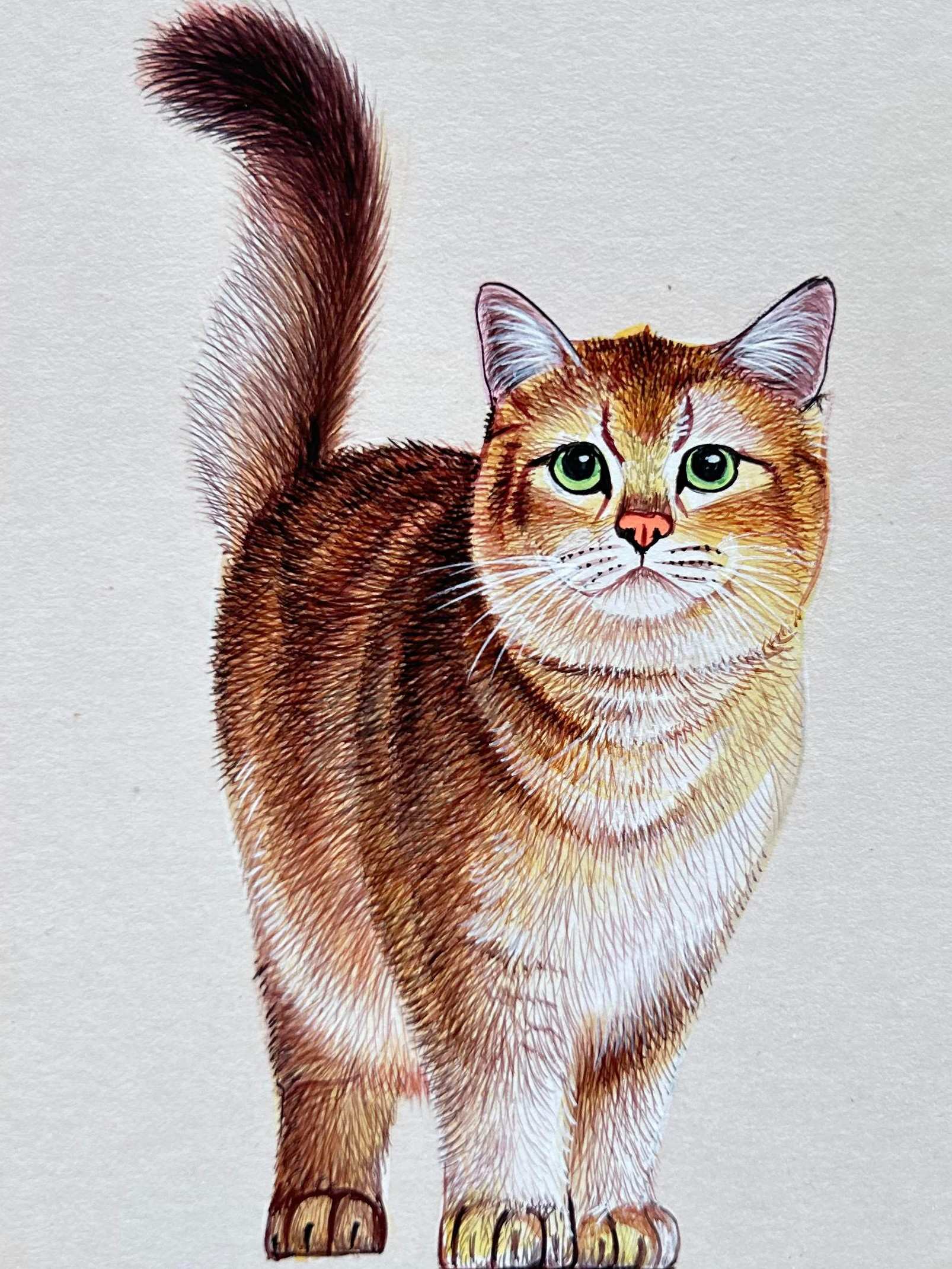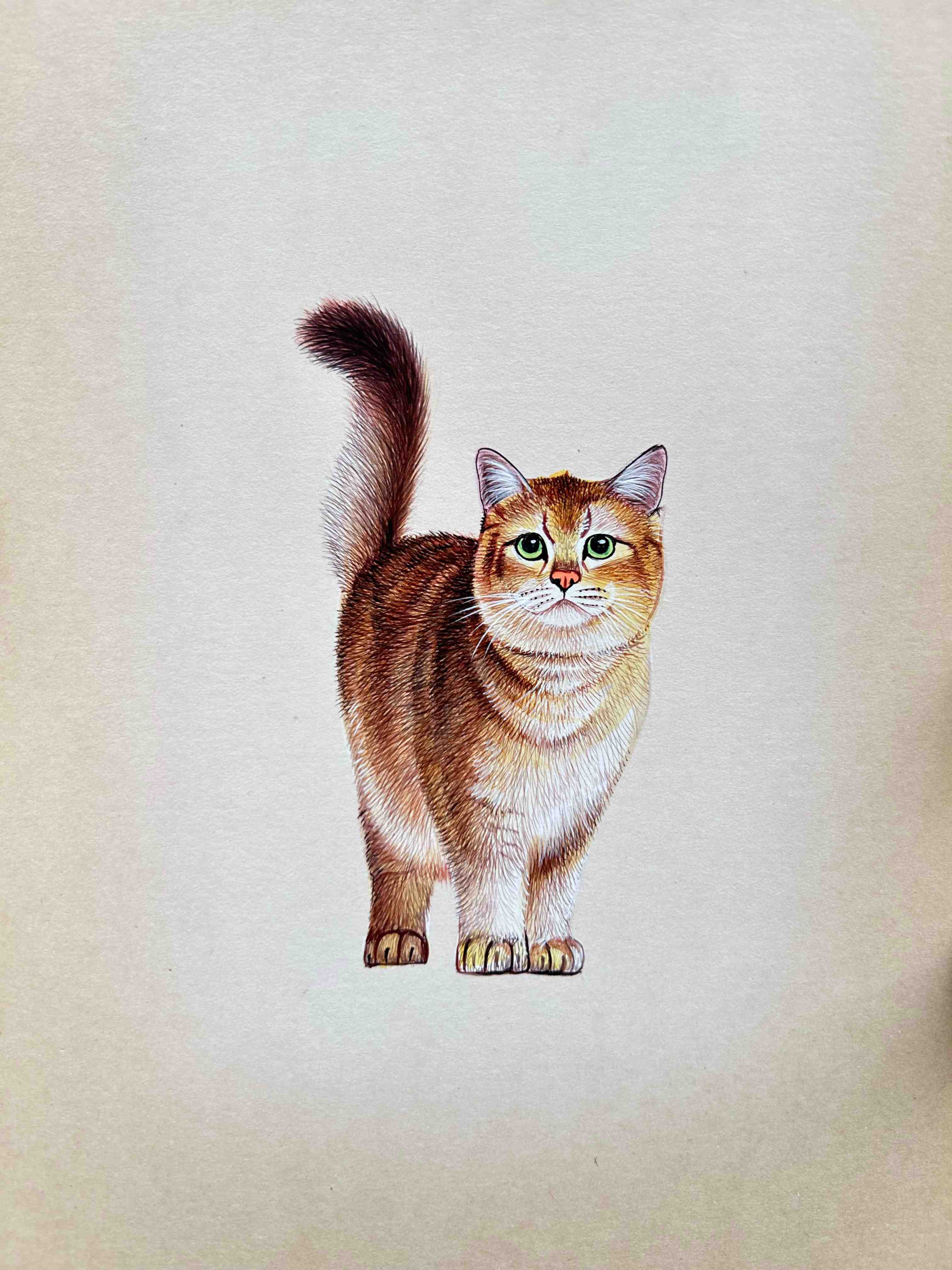 Mohan Prajapati, the gifted artist, skillfully unveils the enchanting Somali cat in his miniature painting, a breed often likened to the graceful fox cat due to its distinctive pointed ears. With meticulous brushwork and intricate details, he captures the luxurious fur and bushy tail of this feline companion. This artwork is a testament to the Mughal School of miniature painting, an opulent fusion of Indian and Safavid Persian styles that originated in the 6th and 7th centuries BCE. Under the patronage of Mughal emperors like Akbar and Jahangir, miniature art flourished as the primary mode of historical documentation. As the 18th century drew to a close, Mughal miniatures began to wane in popularity, but the legacy endures as Rajasthan continues to preserve and pass on the traditional skills of this delicate art form. Prajapati's miniature painting not only celebrates the Somali cat but also pays homage to a rich artistic tradition where colors, patterns, and motifs were woven together to tell vivid stories in a compact canvas.