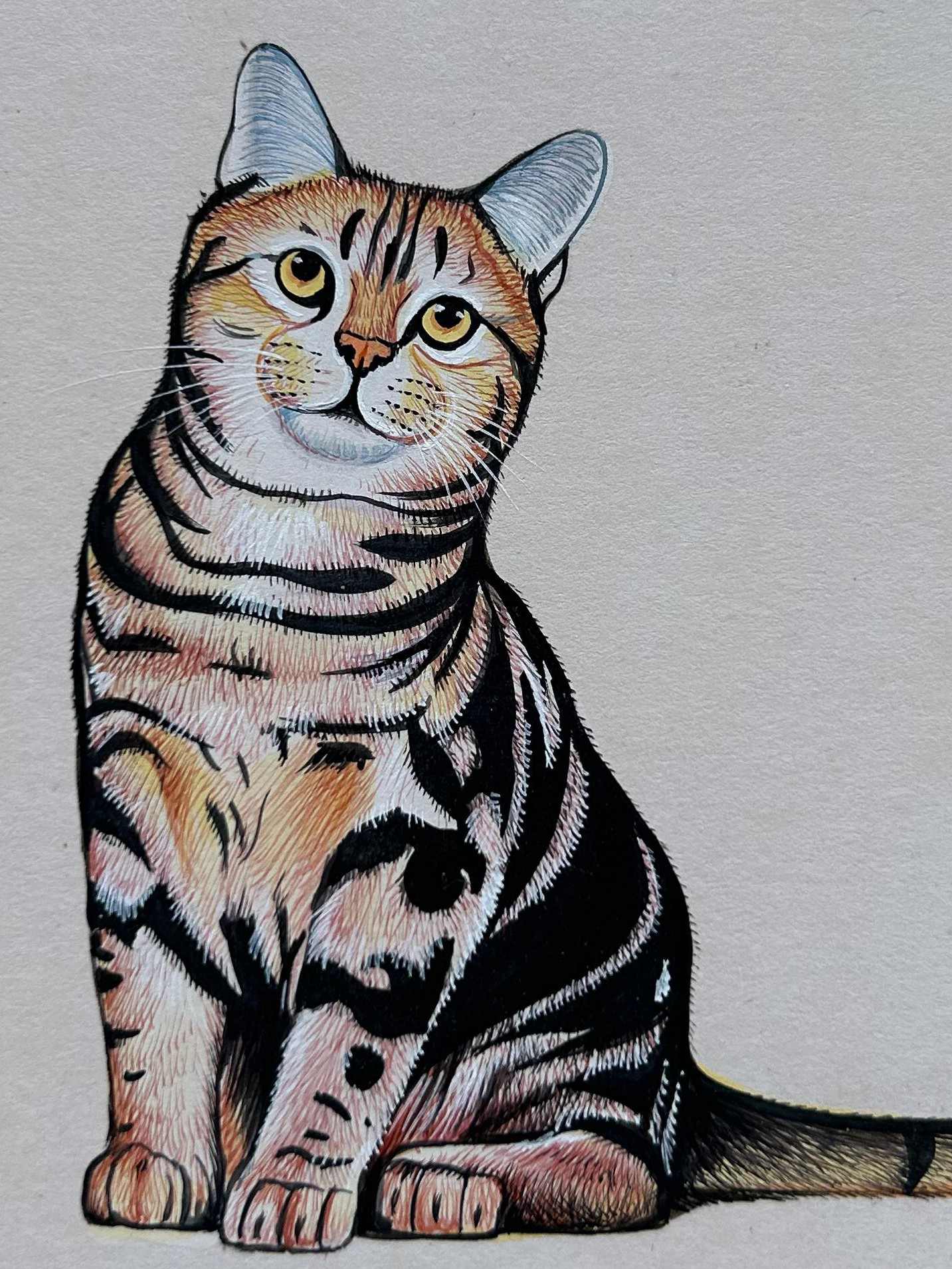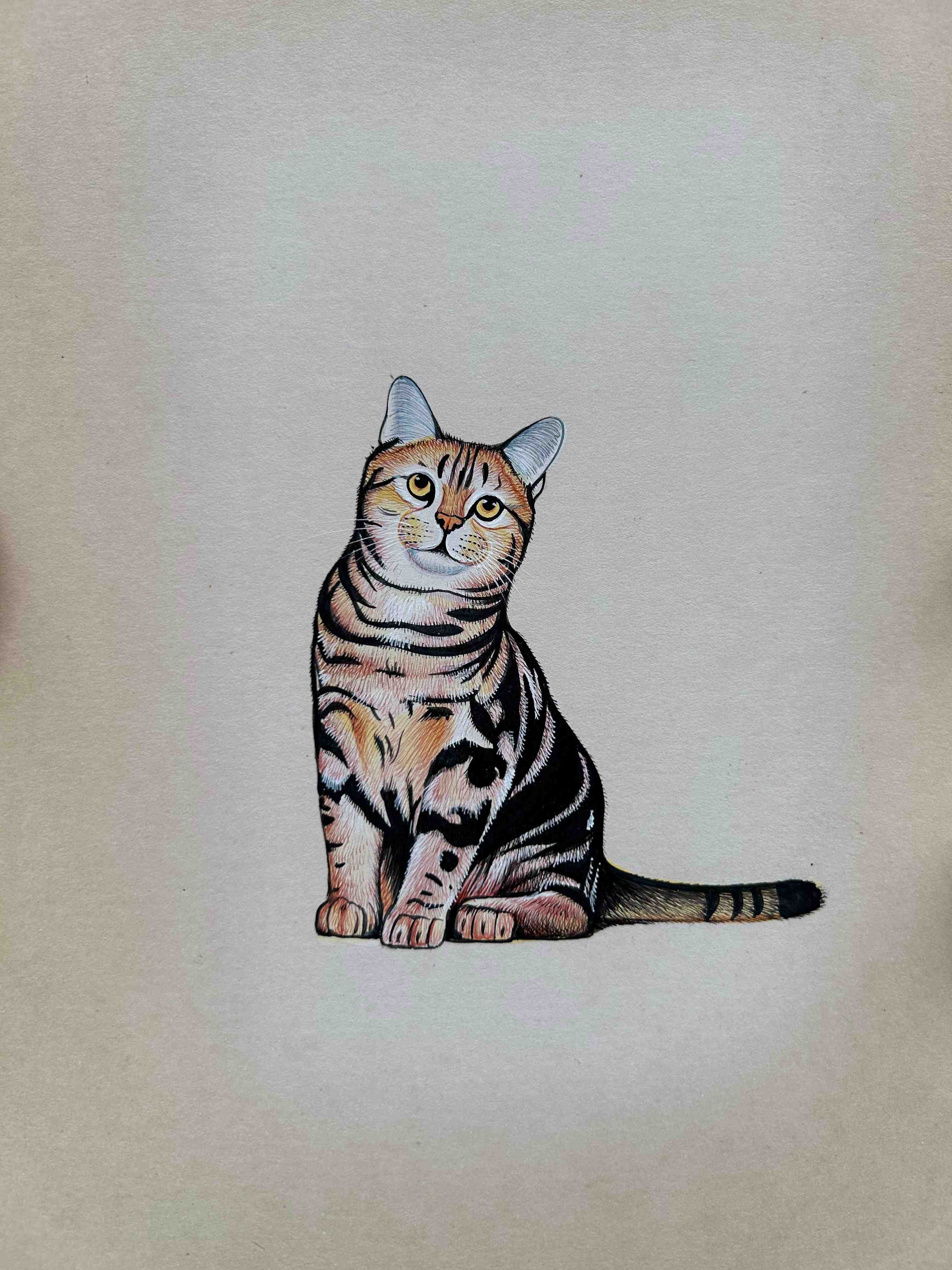 Mohan Prajapati, the gifted artist, skillfully unveils the enchanting Somali cat in his miniature painting, a breed often likened to the graceful fox cat due to its distinctive pointed ears. With meticulous brushwork and intricate details, he captures the luxurious fur and bushy tail of this feline companion. This artwork is a testament to the Mughal School of miniature painting, an opulent fusion of Indian and Safavid Persian styles that originated in the 6th and 7th centuries BCE. Under the patronage of Mughal emperors like Akbar and Jahangir, miniature art flourished as the primary mode of historical documentation. As the 18th century drew to a close, Mughal miniatures began to wane in popularity, but the legacy endures as Rajasthan continues to preserve and pass on the traditional skills of this delicate art form. Prajapati's miniature painting not only celebrates the Somali cat but also pays homage to a rich artistic tradition where colors, patterns, and motifs were woven together to tell vivid stories in a compact canvas.