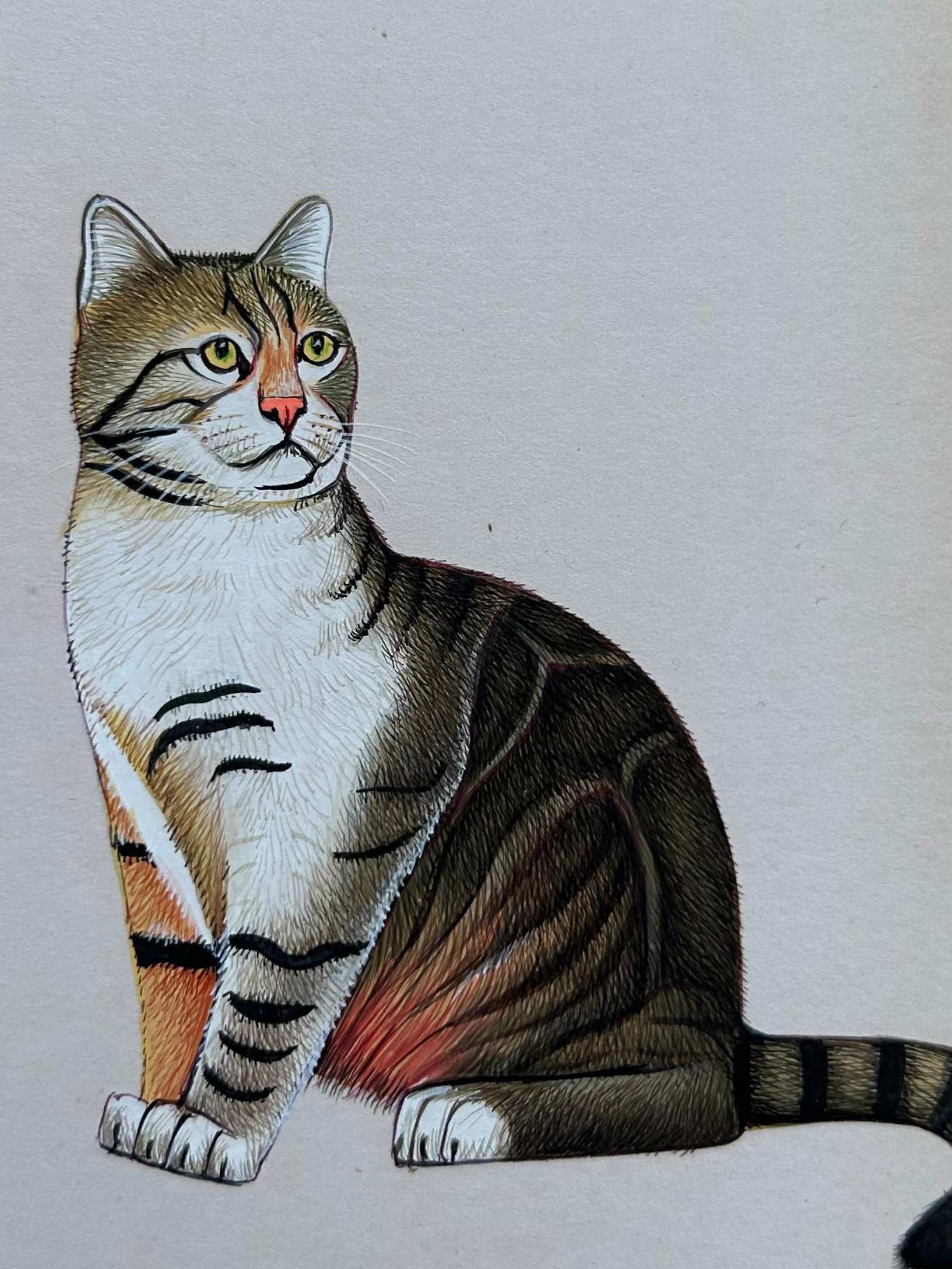 Mohan Prajapati, the gifted artist, skillfully unveils the enchanting Somali cat in his miniature painting, a breed often likened to the graceful fox cat due to its distinctive pointed ears. With meticulous brushwork and intricate details, he captures the luxurious fur and bushy tail of this feline companion. This artwork is a testament to the Mughal School of miniature painting, an opulent fusion of Indian and Safavid Persian styles that originated in the 6th and 7th centuries BCE. Under the patronage of Mughal emperors like Akbar and Jahangir, miniature art flourished as the primary mode of historical documentation. As the 18th century drew to a close, Mughal miniatures began to wane in popularity, but the legacy endures as Rajasthan continues to preserve and pass on the traditional skills of this delicate art form. Prajapati's miniature painting not only celebrates the Somali cat but also pays homage to a rich artistic tradition where colors, patterns, and motifs were woven together to tell vivid stories in a compact canvas.