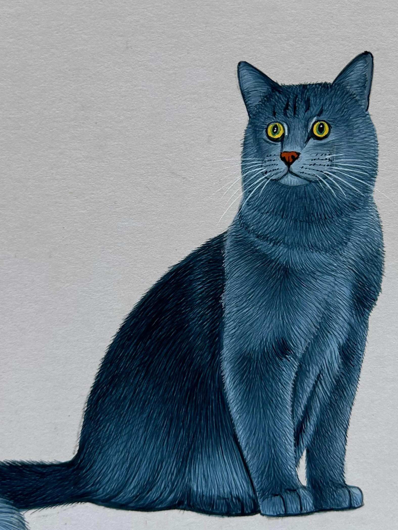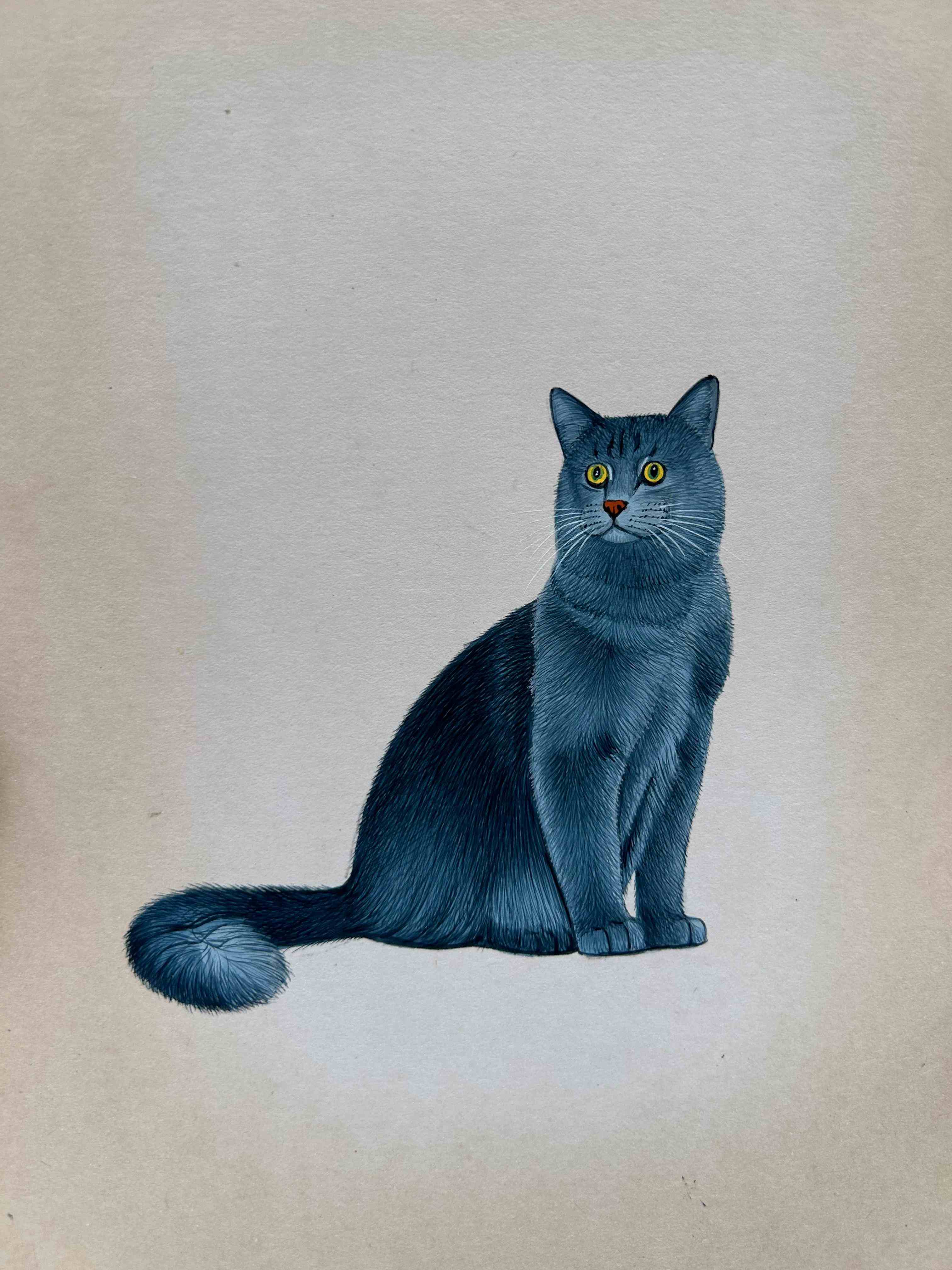 Mohan Prajapati, the gifted artist, skillfully unveils the enchanting Somali cat in his miniature painting, a breed often likened to the graceful fox cat due to its distinctive pointed ears. With meticulous brushwork and intricate details, he captures the luxurious fur and bushy tail of this feline companion. This artwork is a testament to the Mughal School of miniature painting, an opulent fusion of Indian and Safavid Persian styles that originated in the 6th and 7th centuries BCE. Under the patronage of Mughal emperors like Akbar and Jahangir, miniature art flourished as the primary mode of historical documentation. As the 18th century drew to a close, Mughal miniatures began to wane in popularity, but the legacy endures as Rajasthan continues to preserve and pass on the traditional skills of this delicate art form. Prajapati's miniature painting not only celebrates the Somali cat but also pays homage to a rich artistic tradition where colors, patterns, and motifs were woven together to tell vivid stories in a compact canvas.