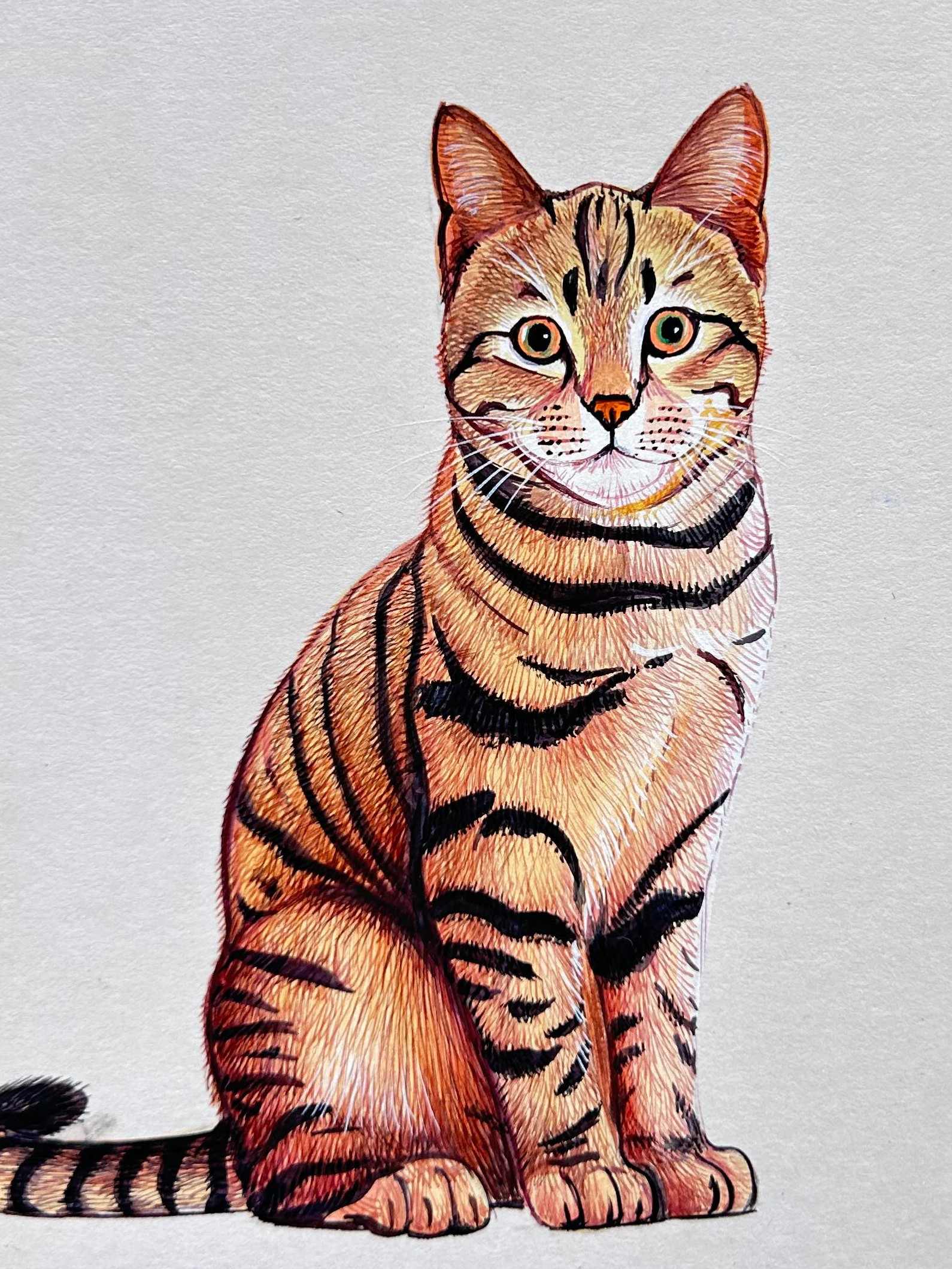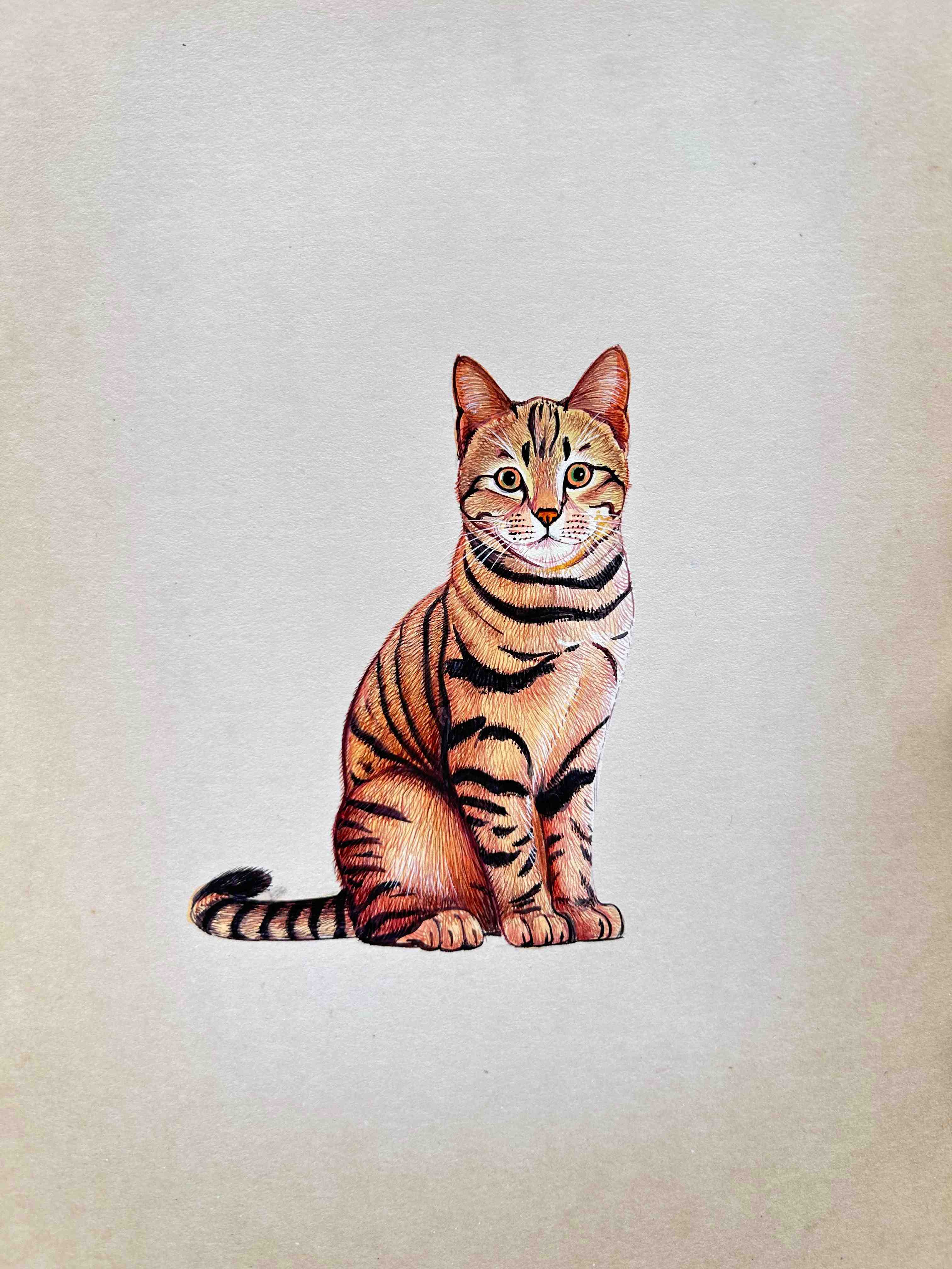 Mohan Prajapati, the gifted artist, skillfully unveils the enchanting Somali cat in his miniature painting, a breed often likened to the graceful fox cat due to its distinctive pointed ears. With meticulous brushwork and intricate details, he captures the luxurious fur and bushy tail of this feline companion. This artwork is a testament to the Mughal School of miniature painting, an opulent fusion of Indian and Safavid Persian styles that originated in the 6th and 7th centuries BCE. Under the patronage of Mughal emperors like Akbar and Jahangir, miniature art flourished as the primary mode of historical documentation. As the 18th century drew to a close, Mughal miniatures began to wane in popularity, but the legacy endures as Rajasthan continues to preserve and pass on the traditional skills of this delicate art form. Prajapati's miniature painting not only celebrates the Somali cat but also pays homage to a rich artistic tradition where colors, patterns, and motifs were woven together to tell vivid stories in a compact canvas.