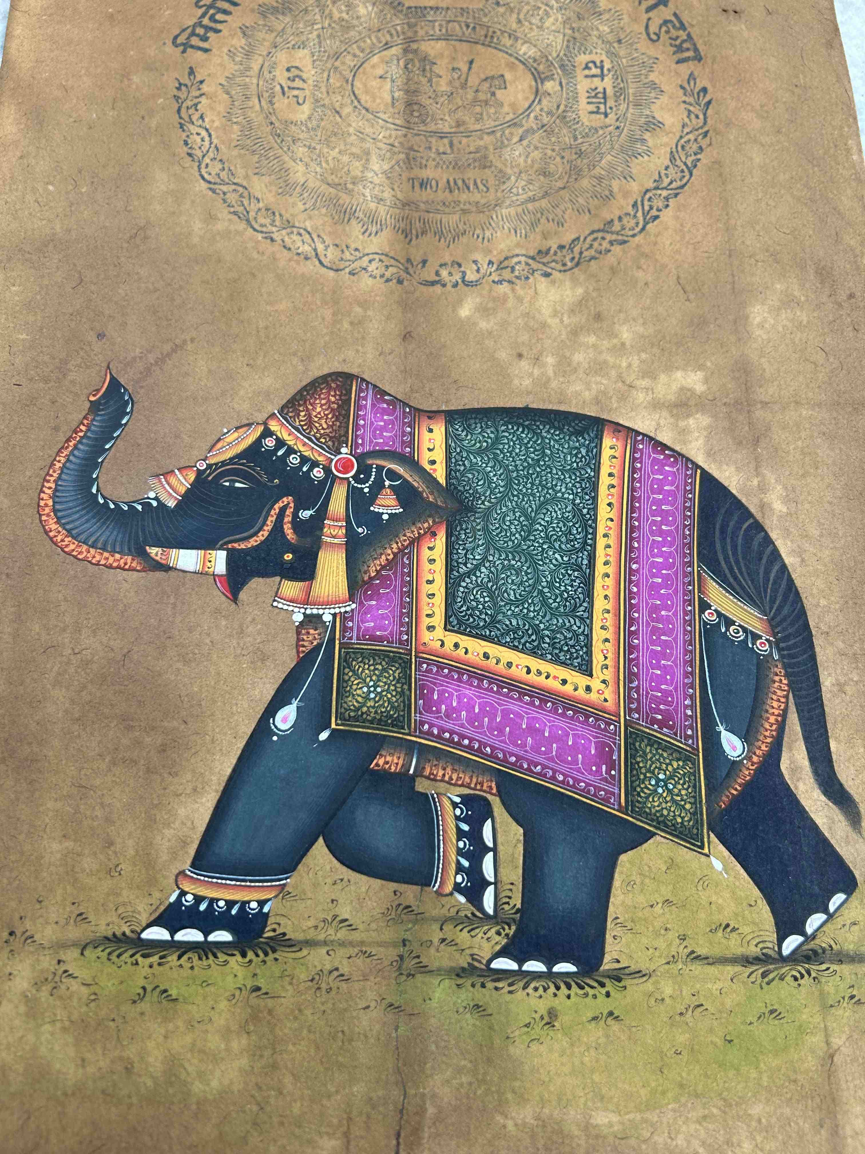 Alluringly detailed miniature painting on an old stamp paper of jaipur. Miniature paintings were first introduced in India during the Mughal period and with the passage of time, many regions of the Indian subcontinent developed their own miniature style. The main attraction of this painting is the Elephant in the centre. This nature-based miniature painting will give a royal look to the interior of your artist mohan prajapati