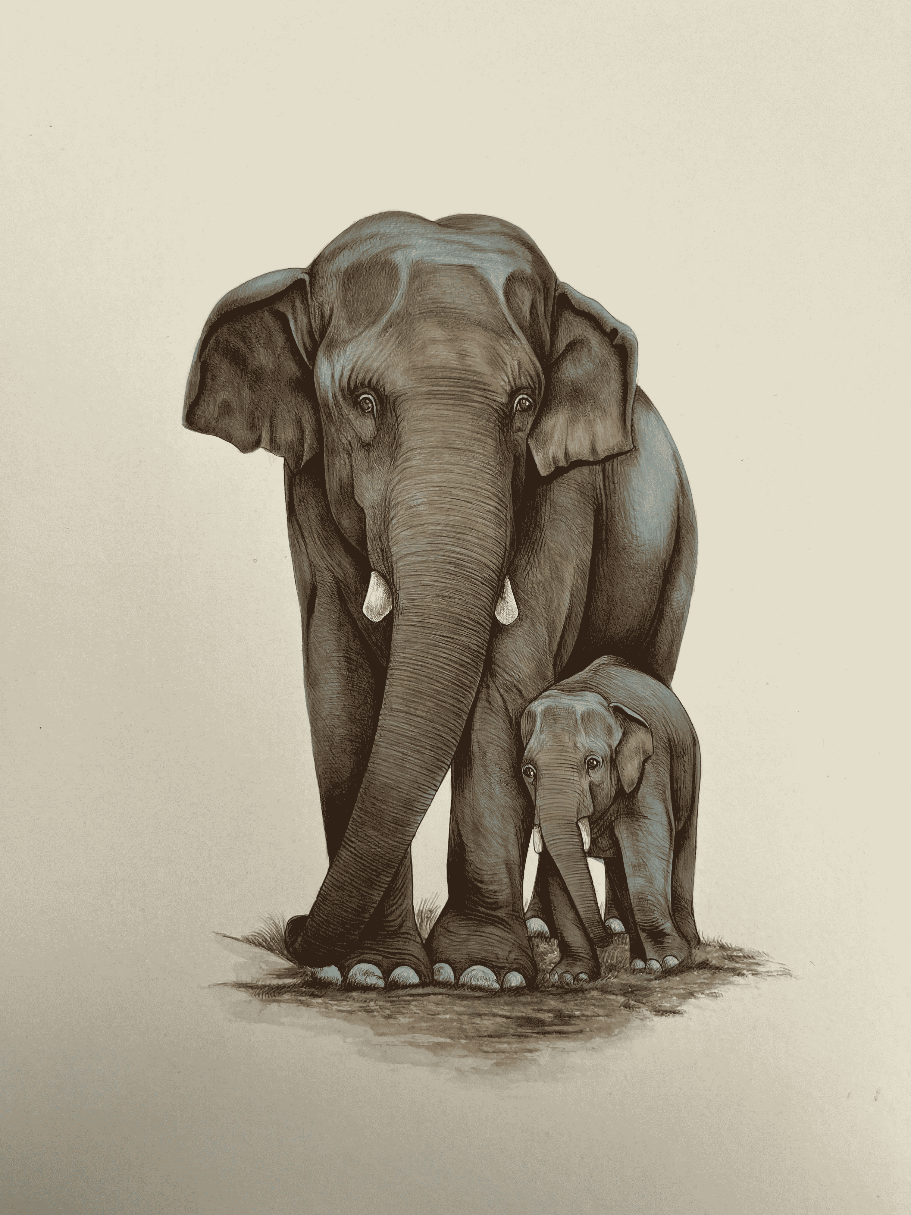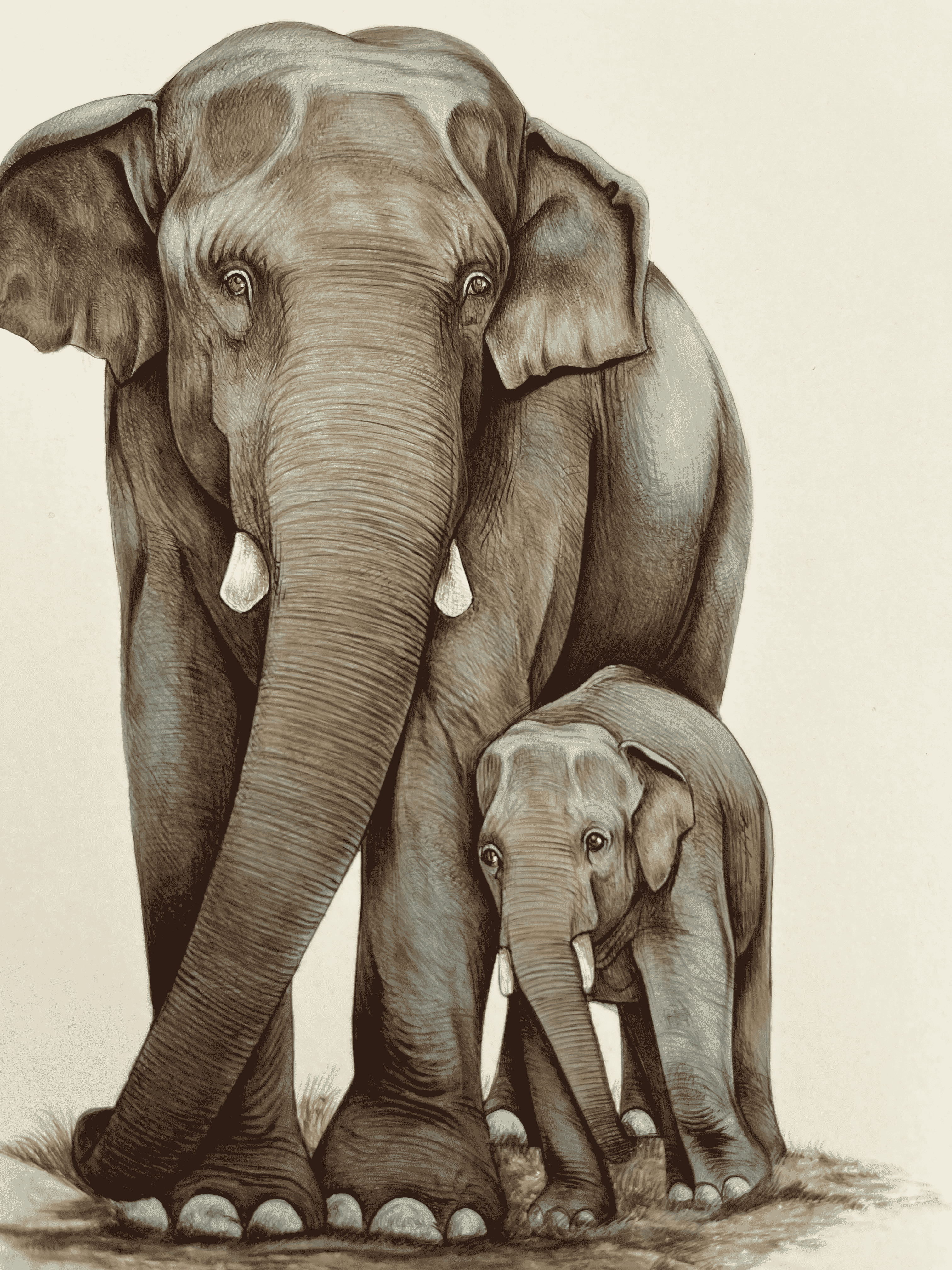 A elephant Mother and son depicting love for each other showing in realistic miniature painting.