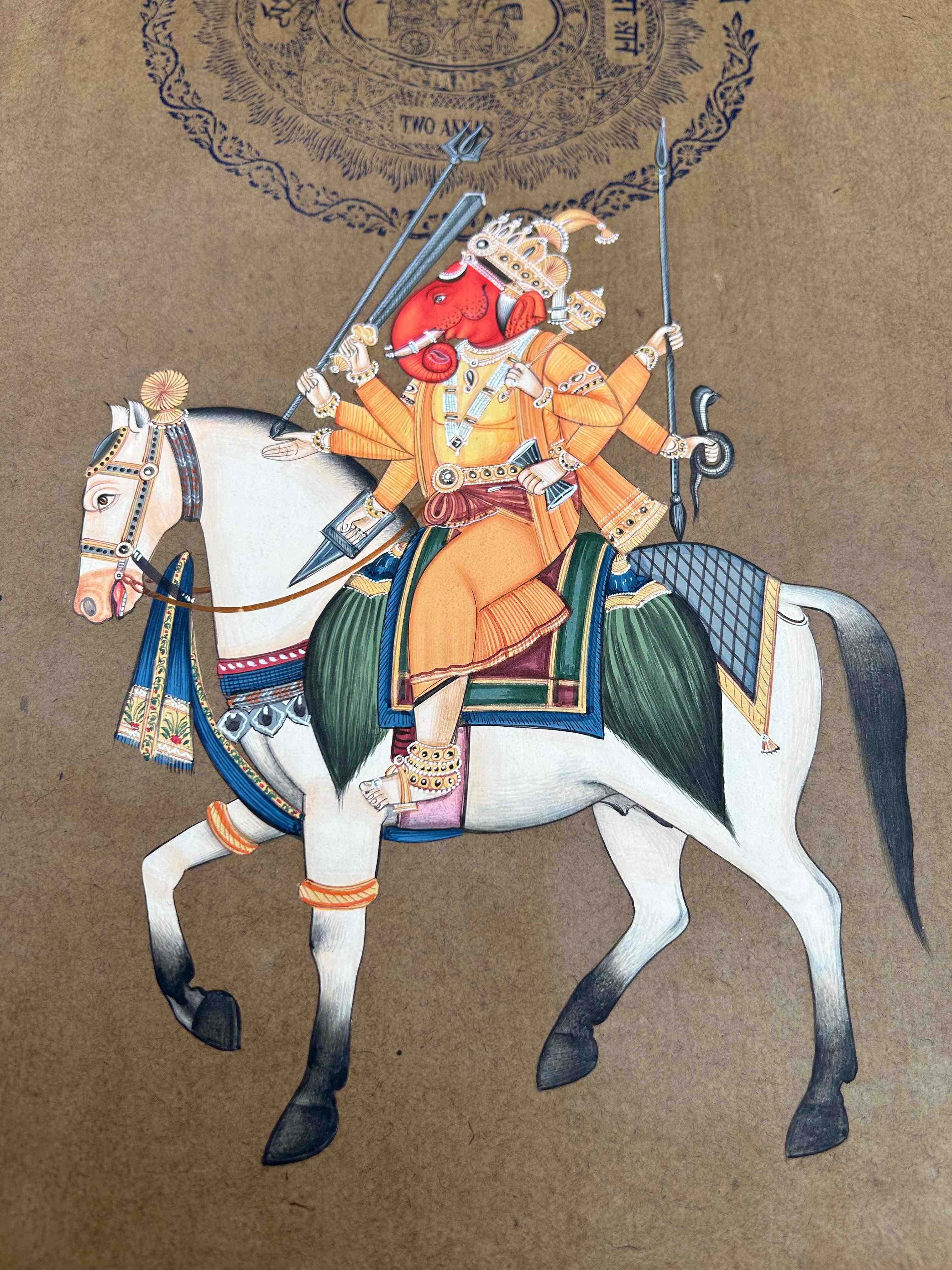 Alluringly detailed miniature painting on an old stamp paper. Miniature paintings were first introduced in India during the Mughal period and with the passage of time, many regions of the Indian subcontinent developed their own miniature style. The main attraction of this painting is the Ganesh ji in the centre. This nature-based miniature painting will give a royal look to the interior of your home.