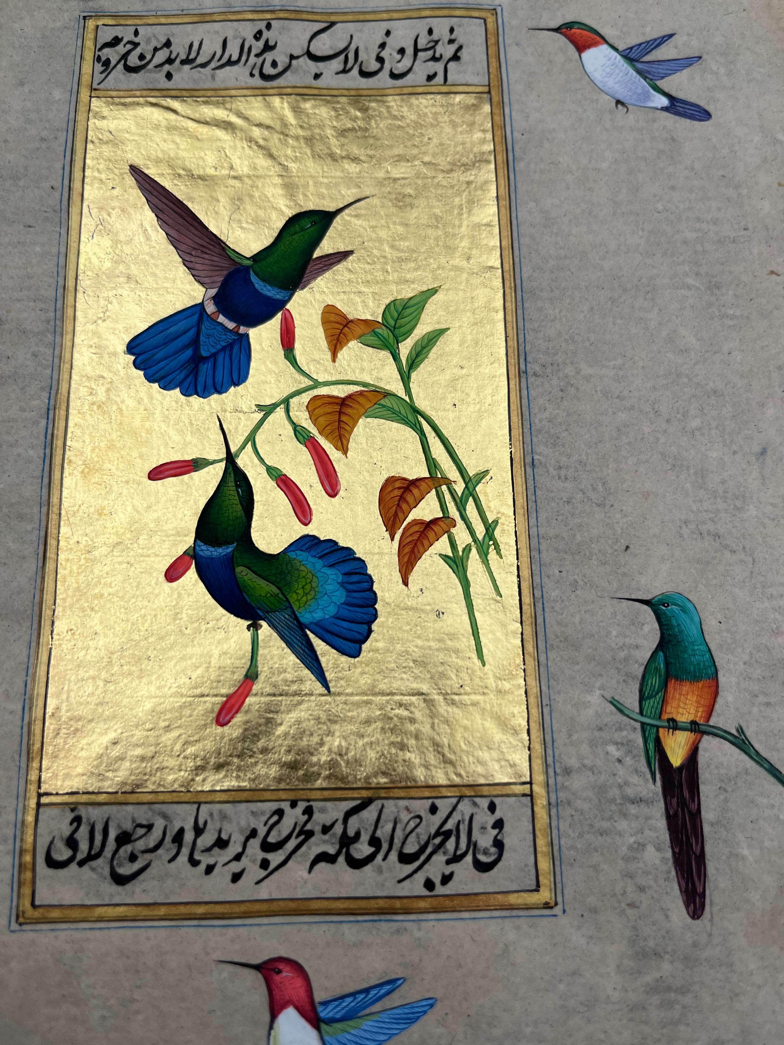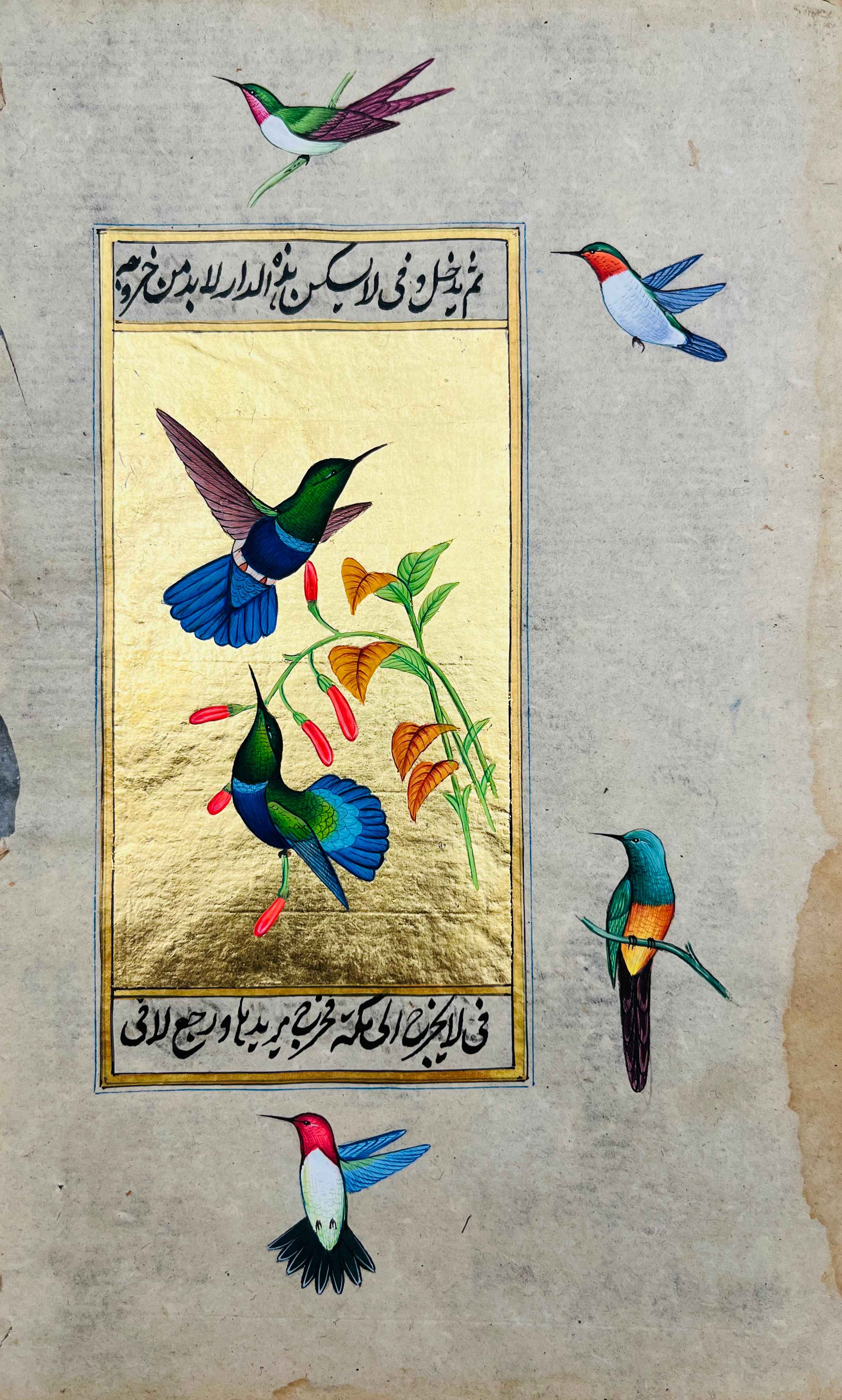 Humming Bird Miniature Painting On Antique Paper 24 Carret Gold Foil Used In Base . Natural Stone Colours Used In Miniature Painting .Done by Mohan Prajapati