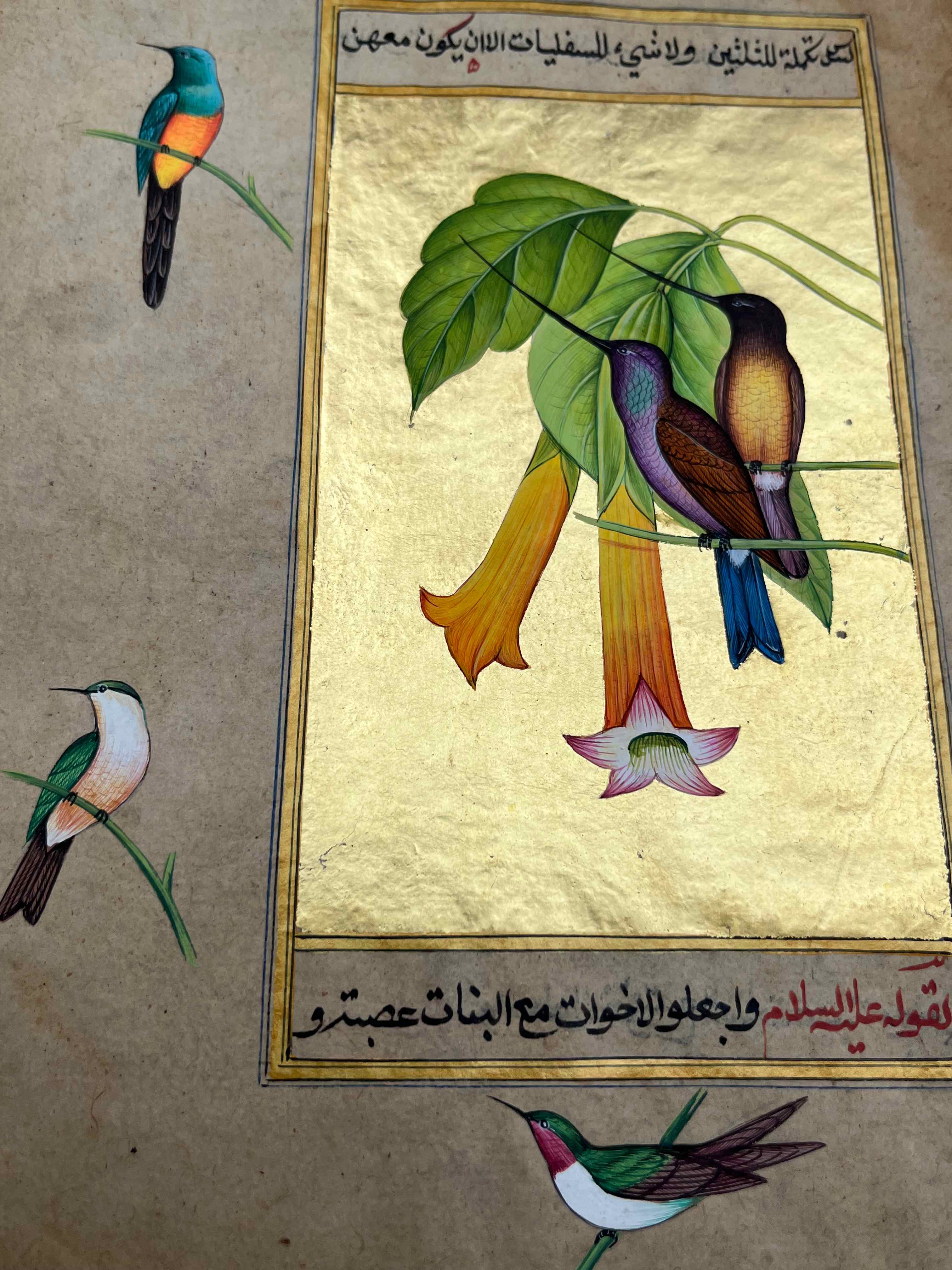 Humming Bird Miniature Painting On Antique Paper 24 Carret Gold Foil Used In Base . Natural Stone Colours Used In Miniature Painting .Done by Mohan Prajapati