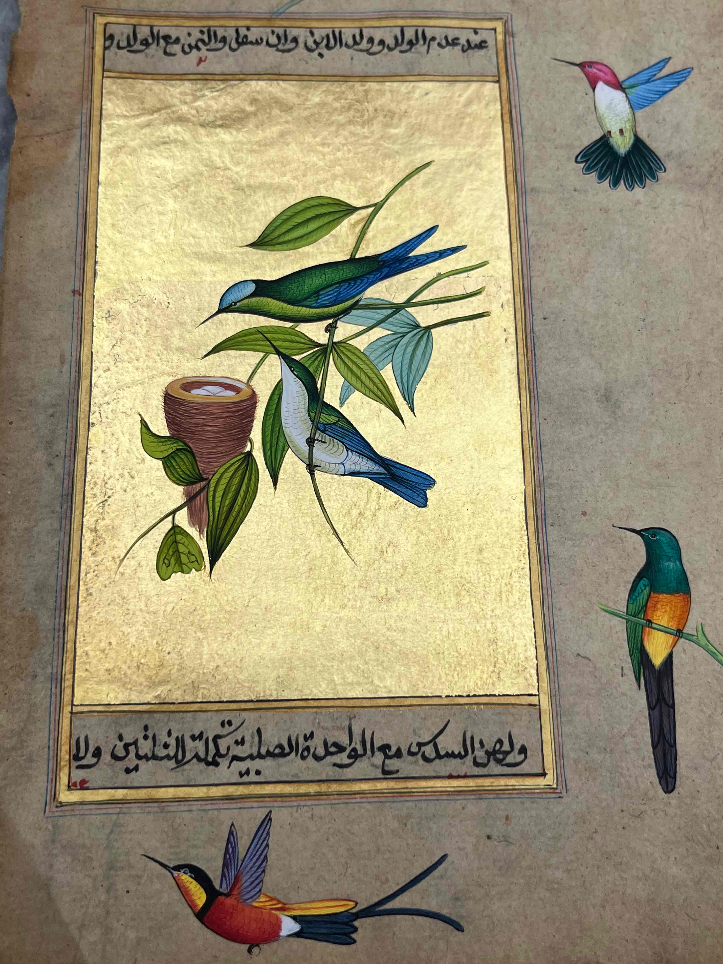 Humming Bird Miniature Painting On Antique Paper 24 Carret Gold Foil Used In Base . Natural Stone Colours Used In Miniature Painting .Done by Mohan Prajapati