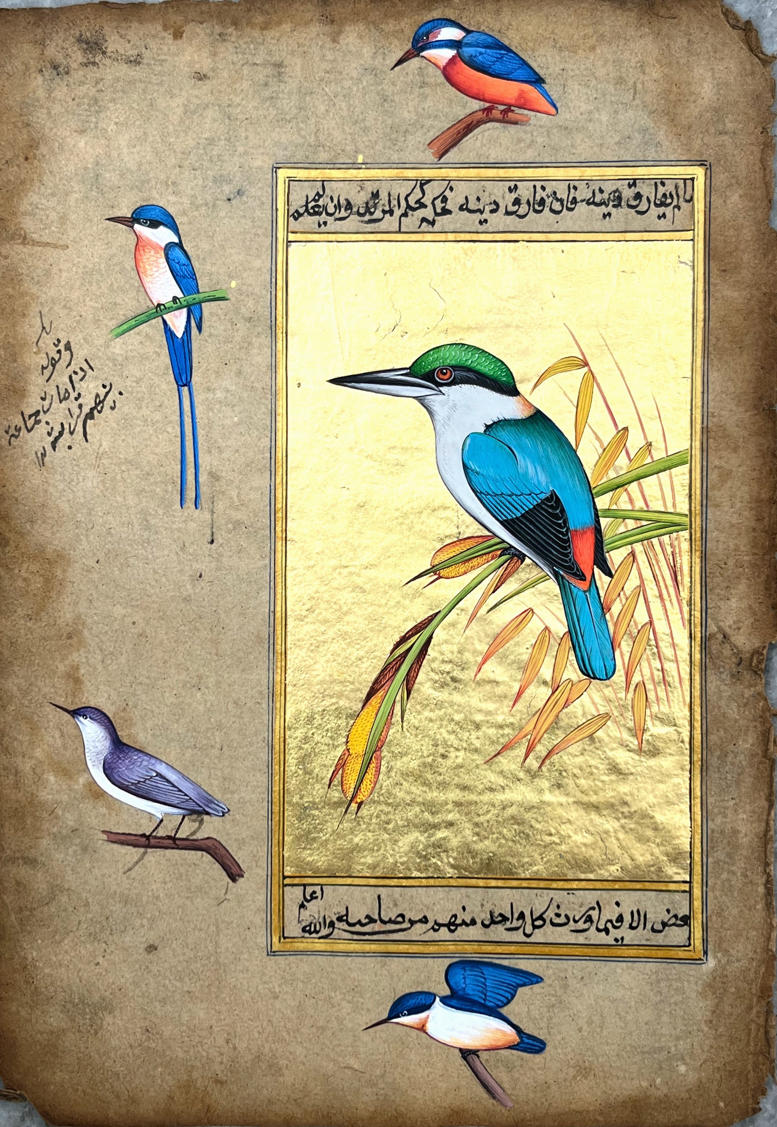 Humming Bird Miniature Painting On Antique Paper 24 Carret Gold Foil Used In Base . Natural Stone Colours Used In Miniature Painting .Done by Mohan Prajapati