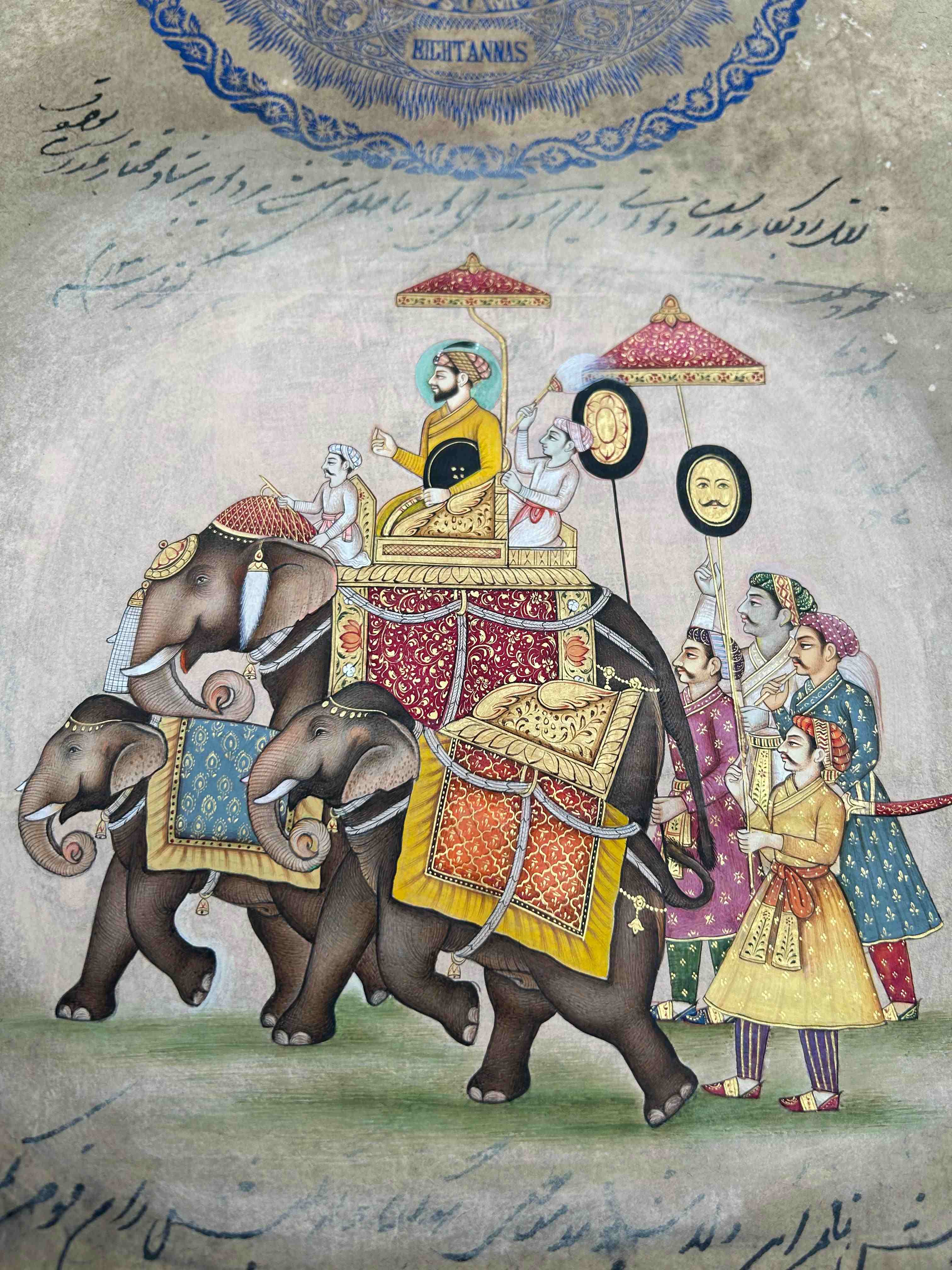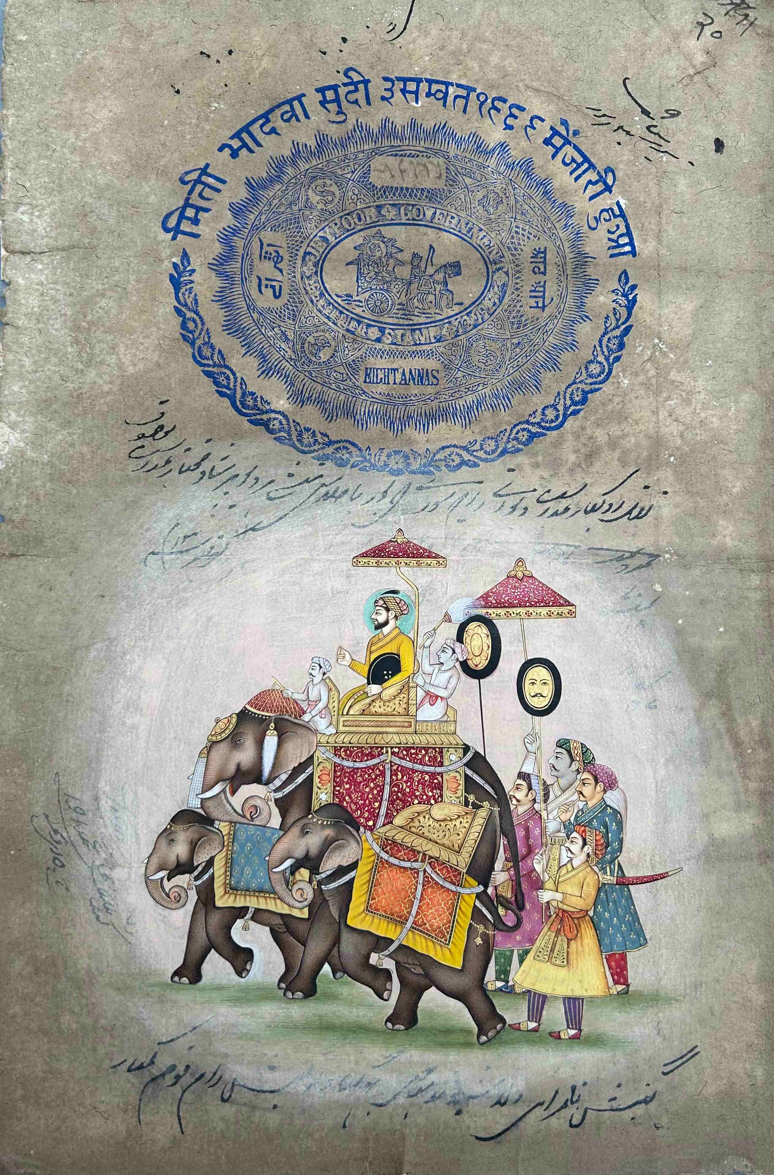 Alluringly detailed miniature painting on an old stamp paper of jaipur. Miniature paintings were first introduced in India during the Mughal period and with the passage of time, many regions of the Indian subcontinent developed their own miniature style. The main attraction of this painting is the Mughal emperor Savari Miniature Painting in the centre. This nature-based miniature painting will give a royal look to the interior of your artist mohan prajapati