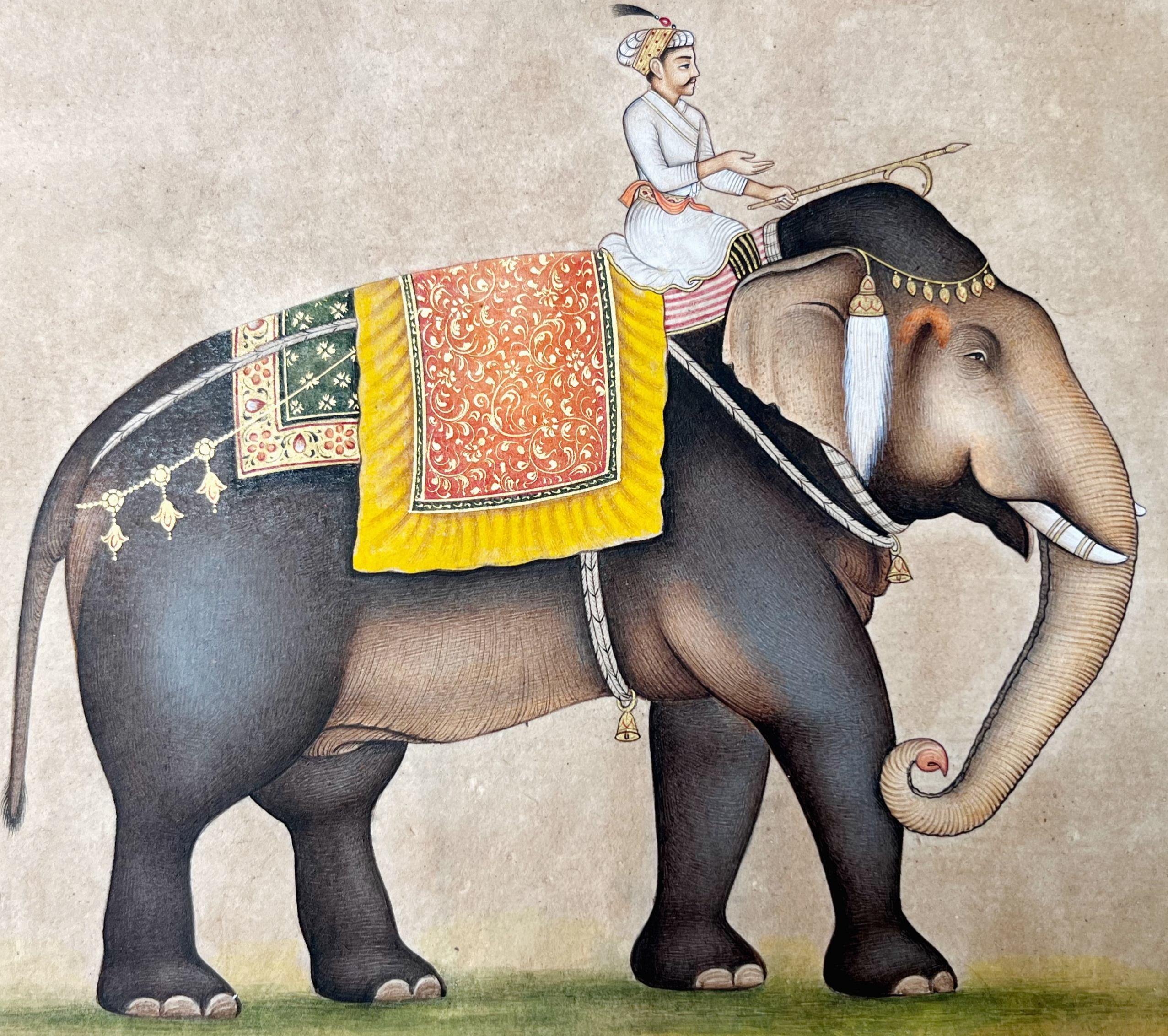 Mohan Prajapati, a master of the brush, brings to life the resplendent charm of the Mughal era in "The Royal Elephant." With meticulous hand-painting, he unveils the grandeur of a Mughal elephant, adorned in all its regal opulence and accessories. This exquisite piece embodies a captivating fusion of Indian artistry, harking back to the ancient 6th and 7th centuries BCE, and the sophisticated Safavid style of the Persian school, giving birth to the Mughal School of miniature painting. Under the generous patronage of Mughal emperors like Akbar and Jahangir, miniature art flourished as the foremost mode of historical documentation. The legacy endures as the schools of miniature painting persevere in passing down their timeless techniques. Rajasthan, in particular, upholds the rich artistic tradition of Mughal miniature paintings, ensuring that this extraordinary art form remains vibrant. In this artwork, Prajapati encapsulates the essence of this enduring artistry, a testament to the intricate beauty, color theory, and motifs that have enriched the cultural tapestry of India for centuries.