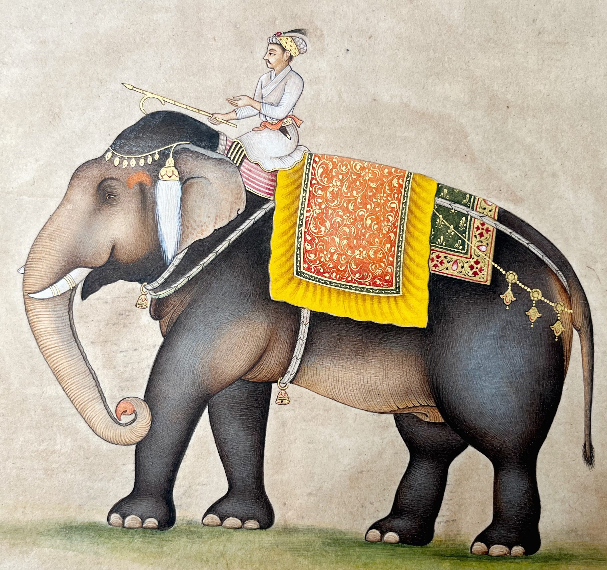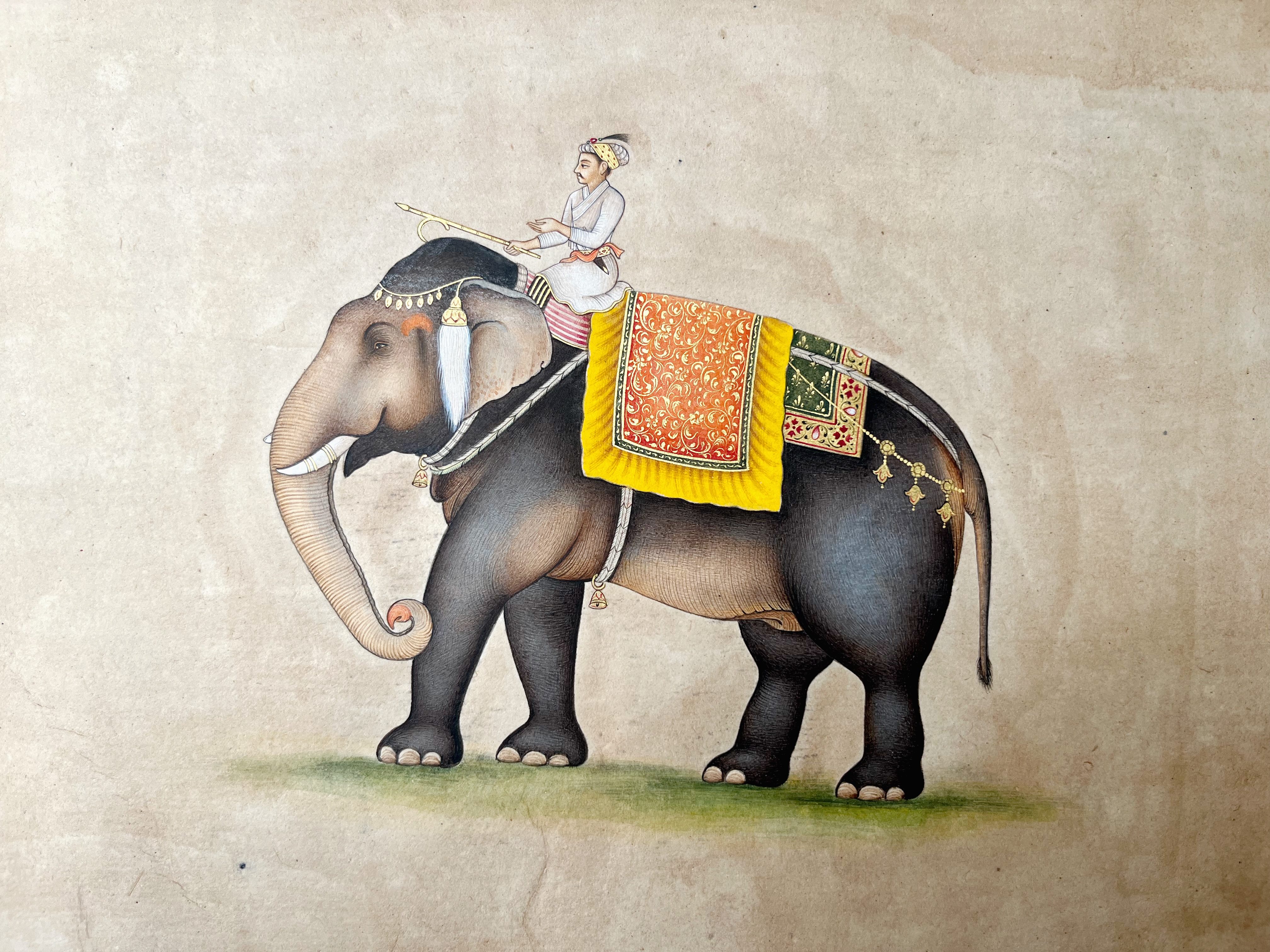 Mohan Prajapati, a master of the brush, brings to life the resplendent charm of the Mughal era in "The Royal Elephant." With meticulous hand-painting, he unveils the grandeur of a Mughal elephant, adorned in all its regal opulence and accessories. This exquisite piece embodies a captivating fusion of Indian artistry, harking back to the ancient 6th and 7th centuries BCE, and the sophisticated Safavid style of the Persian school, giving birth to the Mughal School of miniature painting. Under the generous patronage of Mughal emperors like Akbar and Jahangir, miniature art flourished as the foremost mode of historical documentation. The legacy endures as the schools of miniature painting persevere in passing down their timeless techniques. Rajasthan, in particular, upholds the rich artistic tradition of Mughal miniature paintings, ensuring that this extraordinary art form remains vibrant. In this artwork, Prajapati encapsulates the essence of this enduring artistry, a testament to the intricate beauty, color theory, and motifs that have enriched the cultural tapestry of India for centuries.