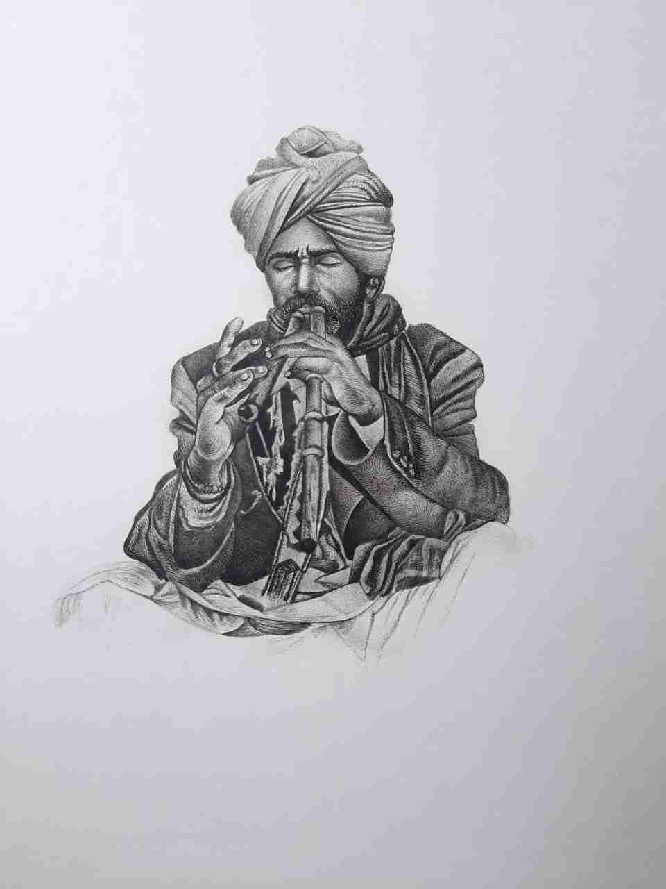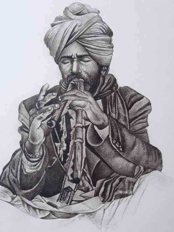 Mohan Prajapati, a masterful artist, skillfully unveils a mesmerizing tapestry of Rajasthan's folk musicians through his meticulous miniature paintings. With every delicate brushstroke, he encapsulates the very essence of these local music legends. This captivating fusion of Indian artistic roots, tracing back to the 6th and 7th centuries BCE, and the Safavid style of the Persian school, culminated in the magnificent Mughal School of miniature painting. Under the patronage of Mughal emperors like Akbar and Jahangir, miniature art evolved into the primary medium for historical documentation. The tradition perseveres, with Rajasthan proudly upholding the artistic lineage of Mughal miniature paintings. Mohan Prajapati's work breathes new life into this heritage, showcasing the vivid color palettes, intricate patterns, and timeless motifs that have endured through the ages. Prajapati’s art is a window to a world steeped in history, a celebration of the rich artistic heritage that still thrives amidst the sands of Rajasthan.