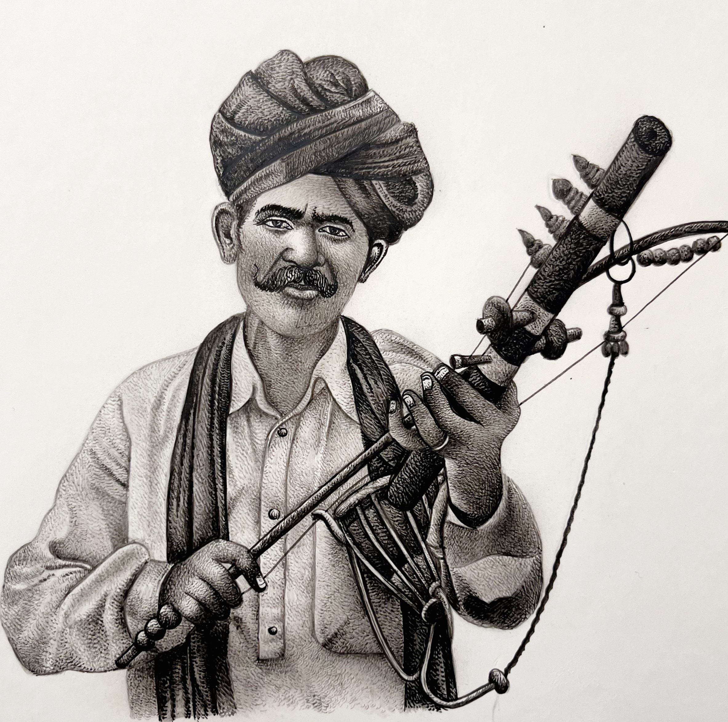 Mohan Prajapati, a masterful artist, skillfully unveils a mesmerizing tapestry of Rajasthan's folk musicians through his meticulous miniature paintings. With every delicate brushstroke, he encapsulates the very essence of these local music legends. This captivating fusion of Indian artistic roots, tracing back to the 6th and 7th centuries BCE, and the Safavid style of the Persian school, culminated in the magnificent Mughal School of miniature painting. Under the patronage of Mughal emperors like Akbar and Jahangir, miniature art evolved into the primary medium for historical documentation. The tradition perseveres, with Rajasthan proudly upholding the artistic lineage of Mughal miniature paintings. Mohan Prajapati's work breathes new life into this heritage, showcasing the vivid color palettes, intricate patterns, and timeless motifs that have endured through the ages. Prajapati’s art is a window to a world steeped in history, a celebration of the rich artistic heritage that still thrives amidst the sands of Rajasthan.