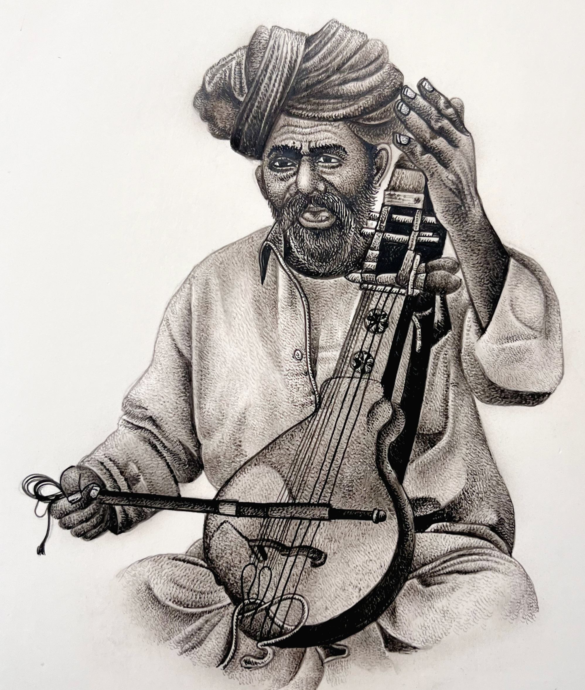 This painting is a traditional musician miniature painting used natural eyeliner and single hair brush . painting size 9"12" inches.