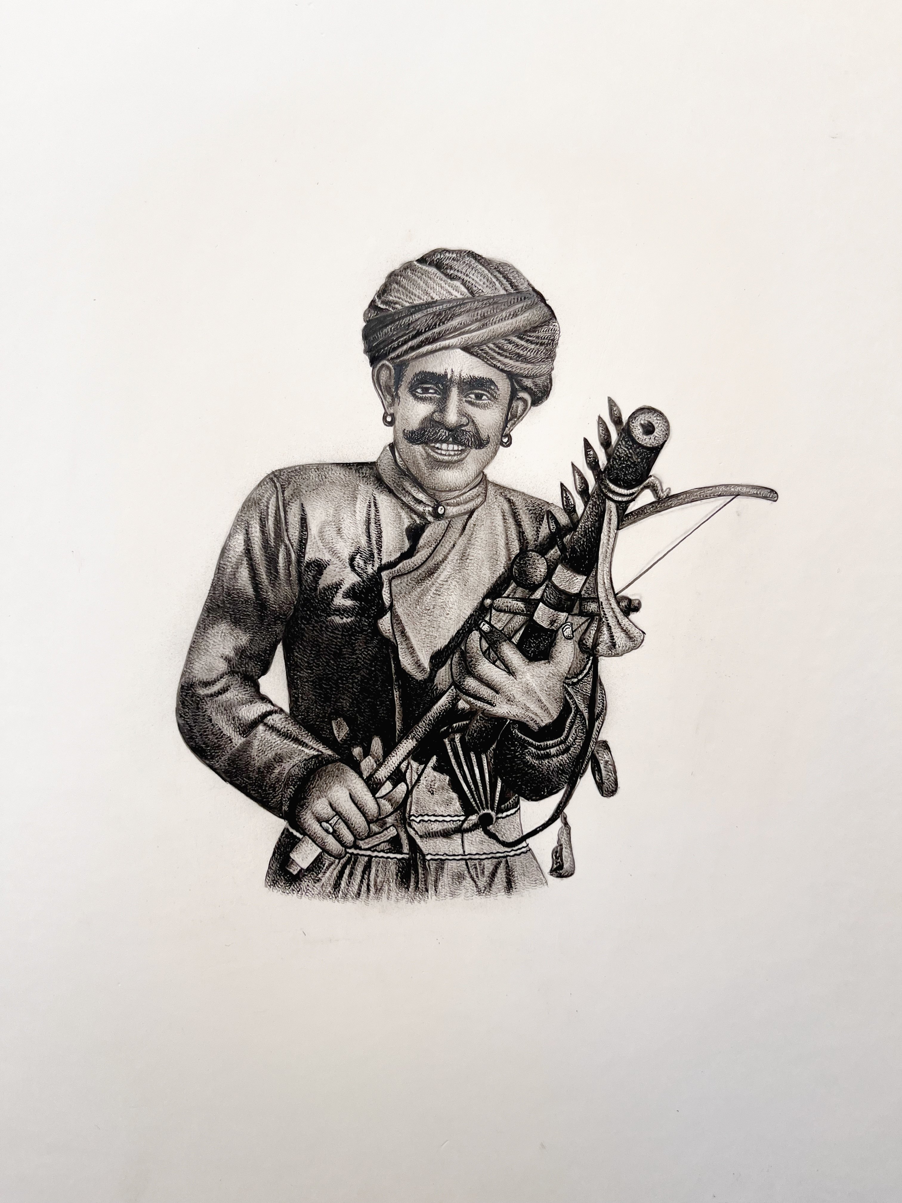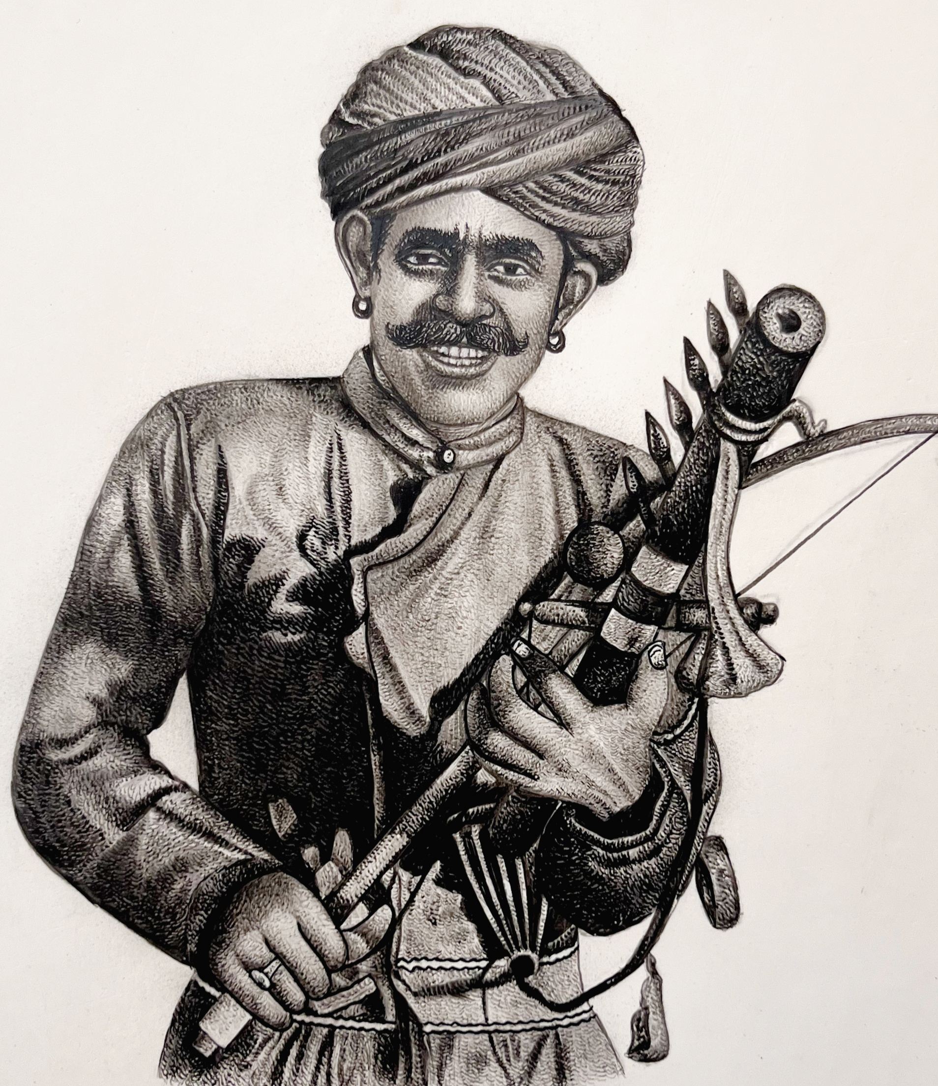 Mohan Prajapati, a masterful artist, skillfully unveils a mesmerizing tapestry of Rajasthan's folk musicians through his meticulous miniature paintings. With every delicate brushstroke, he encapsulates the very essence of these local music legends. This captivating fusion of Indian artistic roots, tracing back to the 6th and 7th centuries BCE, and the Safavid style of the Persian school, culminated in the magnificent Mughal School of miniature painting. Under the patronage of Mughal emperors like Akbar and Jahangir, miniature art evolved into the primary medium for historical documentation. The tradition perseveres, with Rajasthan proudly upholding the artistic lineage of Mughal miniature paintings. Mohan Prajapati's work breathes new life into this heritage, showcasing the vivid color palettes, intricate patterns, and timeless motifs that have endured through the ages. Prajapati’s art is a window to a world steeped in history, a celebration of the rich artistic heritage that still thrives amidst the sands of Rajasthan.
