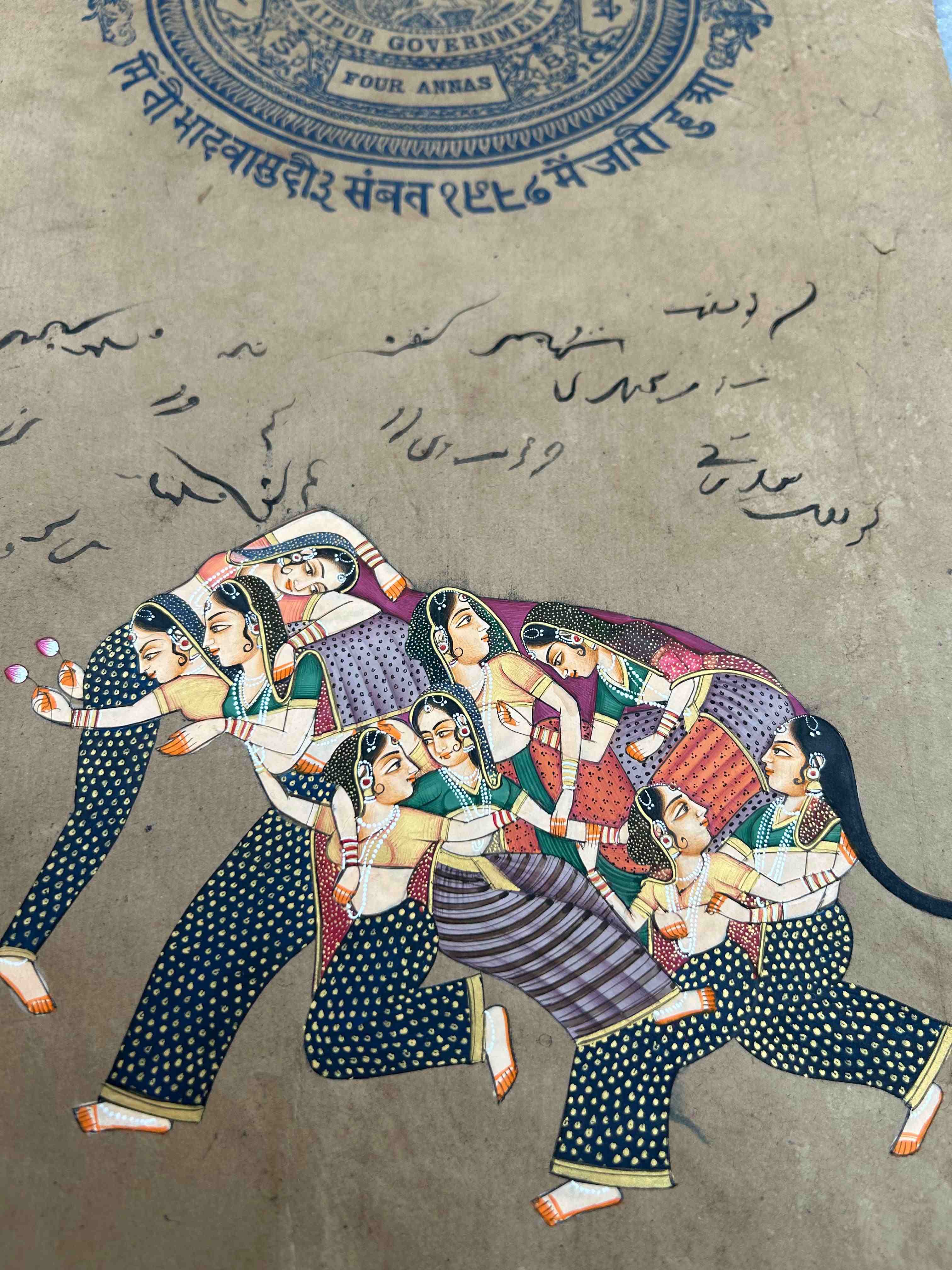 Alluringly detailed miniature painting on an old stamp paper of jaipur. Miniature paintings were first introduced in India during the Mughal period and with the passage of time, many regions of the Indian subcontinent developed their own miniature style. The main attraction of this painting is the Nine Women Elephant in the centre. This nature-based miniature painting will give a royal look to the interior of your artist mohan prajapati