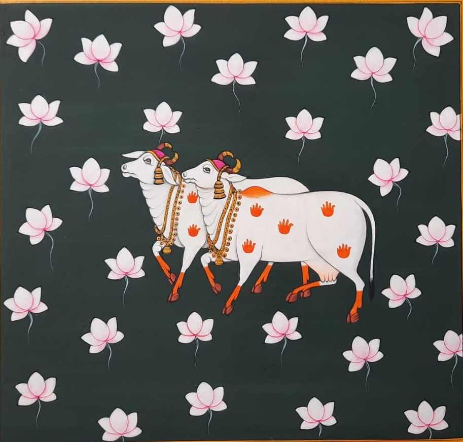 It is a Rajasthan traditional miniature pichwai painting.Natural stone colours and real gold colours used in painting .single hair brush work.Hand made Vasli paper used.Done by mohan prajapati jaipur based artist. Painting size 9" 9.5 " inch