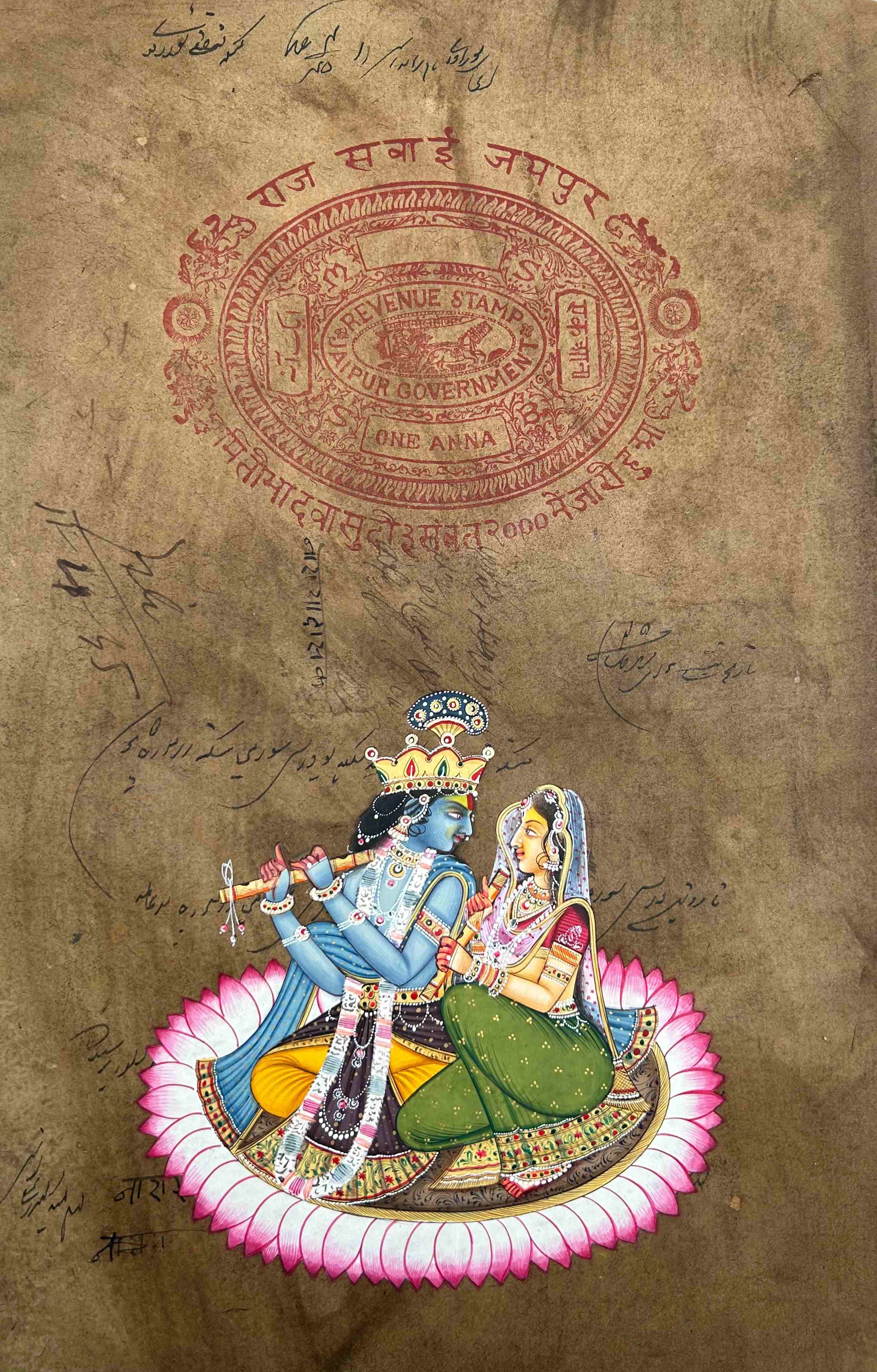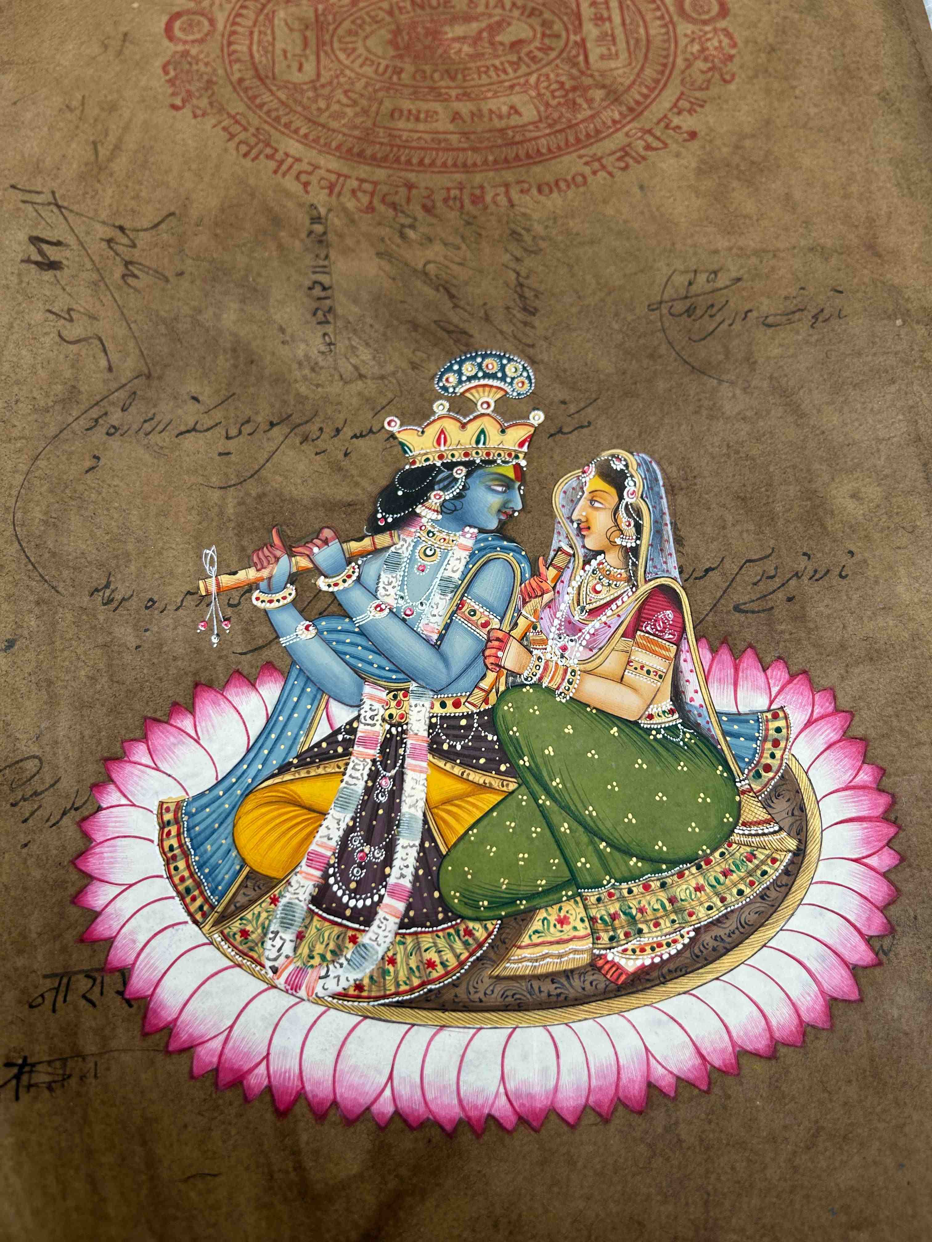 Alluringly detailed miniature painting on an old stamp paper of jaipur. Miniature paintings were first introduced in India during the Mughal period and with the passage of time, many regions of the Indian subcontinent developed their own miniature style. The main attraction of this painting is the Radha Krishna in the centre. This nature-based miniature painting will give a royal look to the interior of your home.