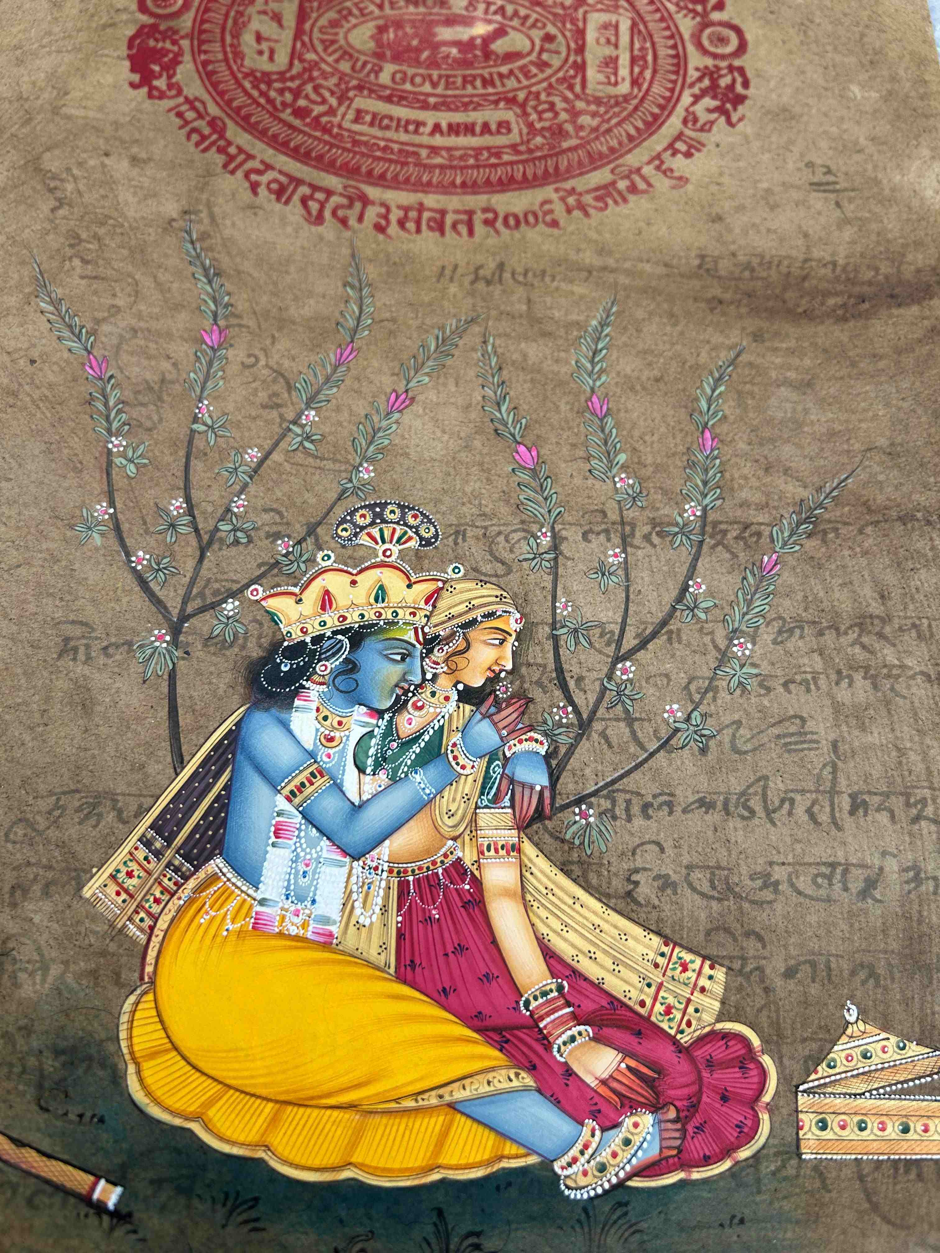 Alluringly detailed miniature painting on an old stamp paper of jaipur. Miniature paintings were first introduced in India during the Mughal period and with the passage of time, many regions of the Indian subcontinent developed their own miniature style. The main attraction of this painting is the Radha Krishna in the centre. This nature-based miniature painting will give a royal look to the interior of your artist mohan prajapati