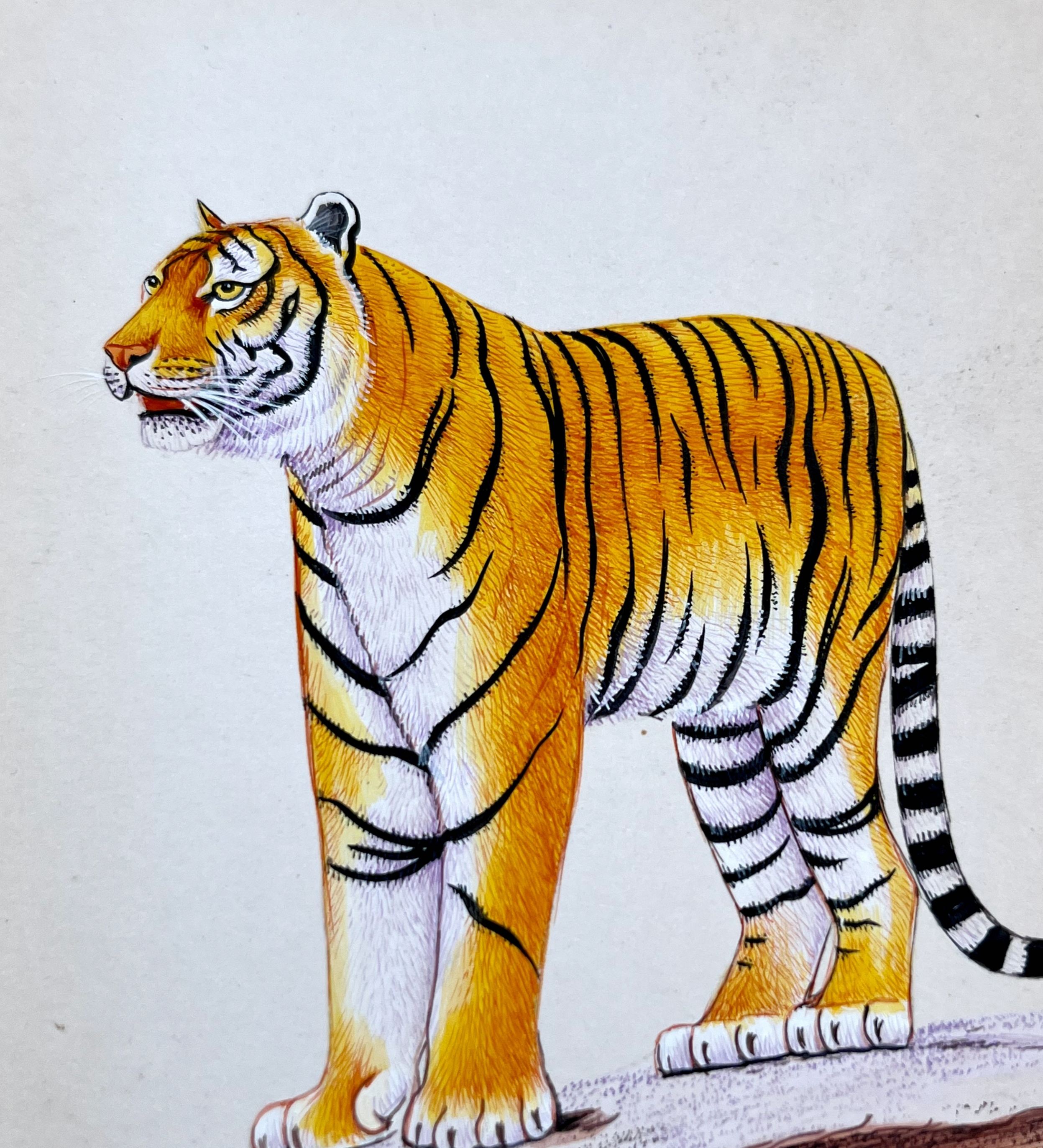 Tiger Miniature Painting On Antique card. Single Hair Brush strokes Fine Detailing Work .Natural Stone Colours Used In Miniature Painting .Done by Mohan Prajapati