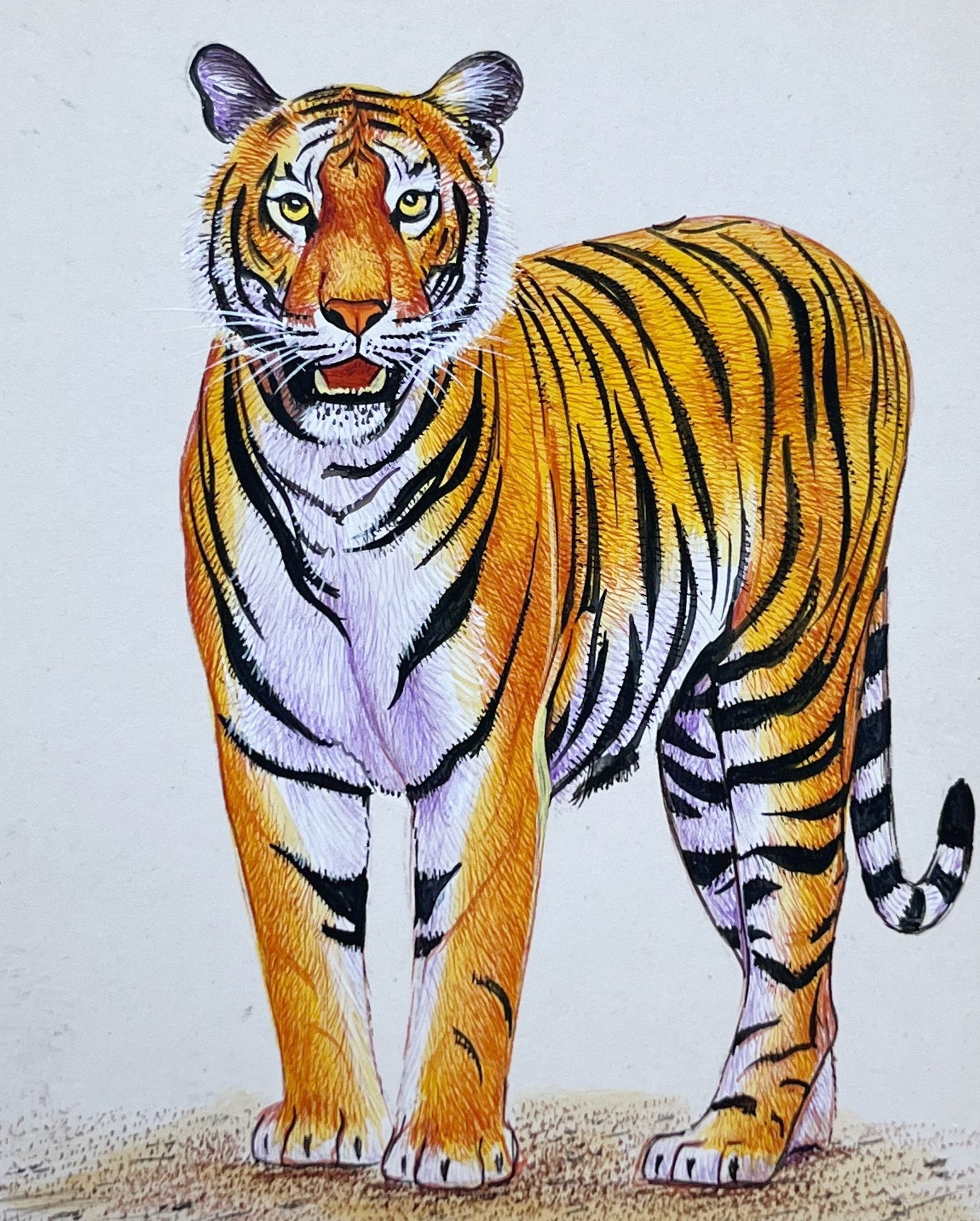 Tiger Miniature Painting On Antique card. Single Hair Brush strokes Fine Detailing Work .Natural Stone Colours Used In Miniature Painting .Done by Mohan Prajapati