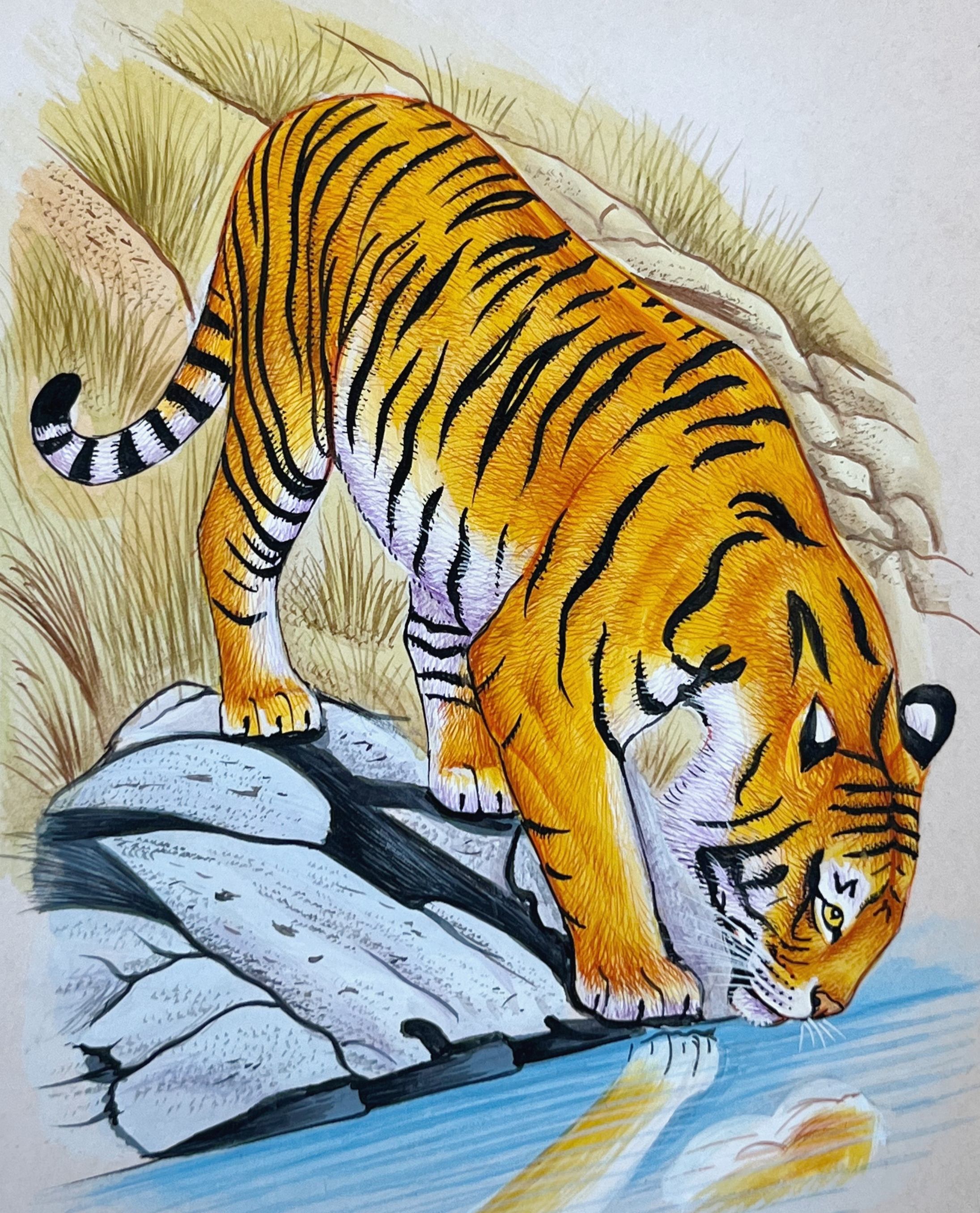 Tiger Miniature Painting On Antique card. Single Hair Brush strokes Fine Detailing Work .Natural Stone Colours Used In Miniature Painting .Done by Mohan Prajapati