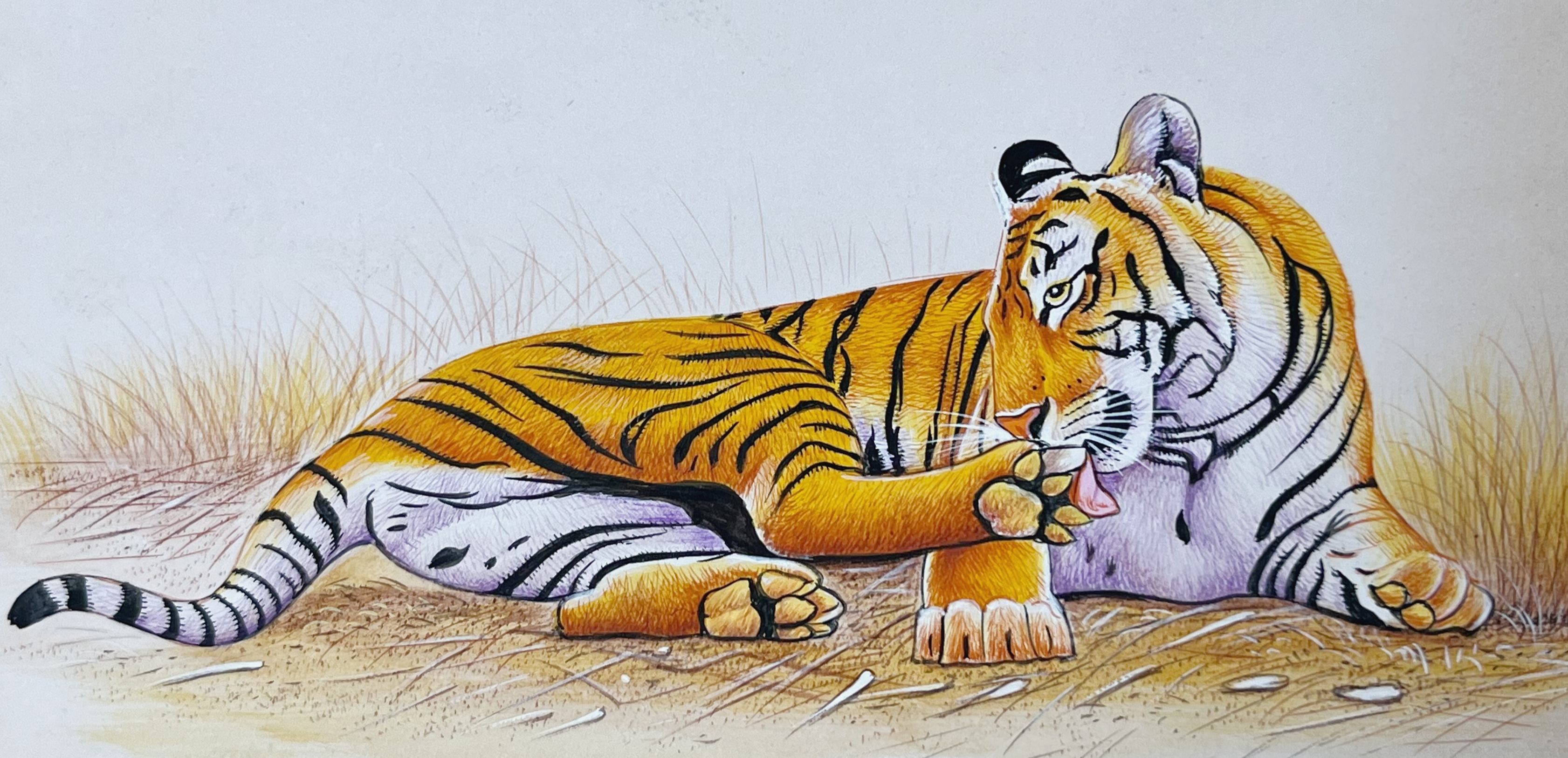 Tiger Miniature Painting On Antique card. Single Hair Brush strokes Fine Detailing Work .Natural Stone Colours Used In Miniature Painting .Done by Mohan Prajapati