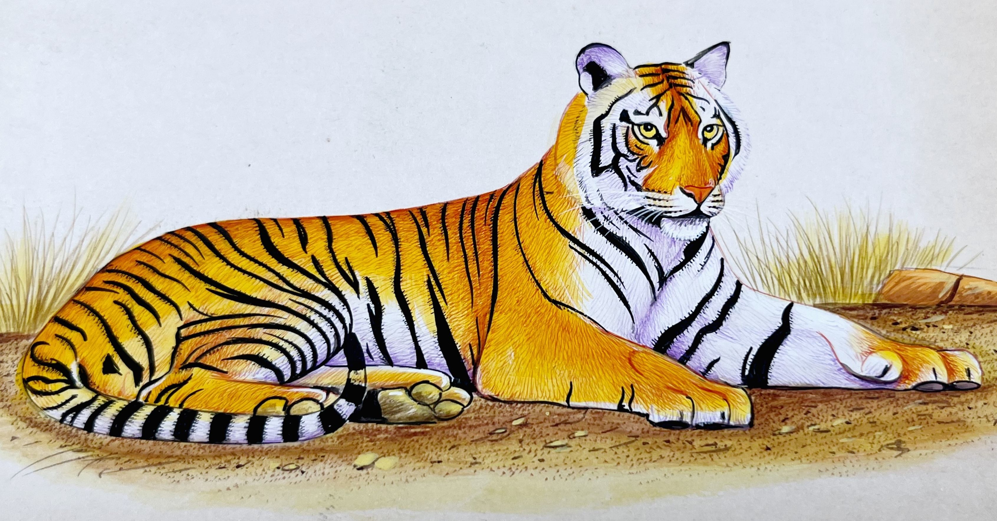 Tiger Miniature Painting On Antique card. Single Hair Brush strokes Fine Detailing Work .Natural Stone Colours Used In Miniature Painting .Done by Mohan Prajapati